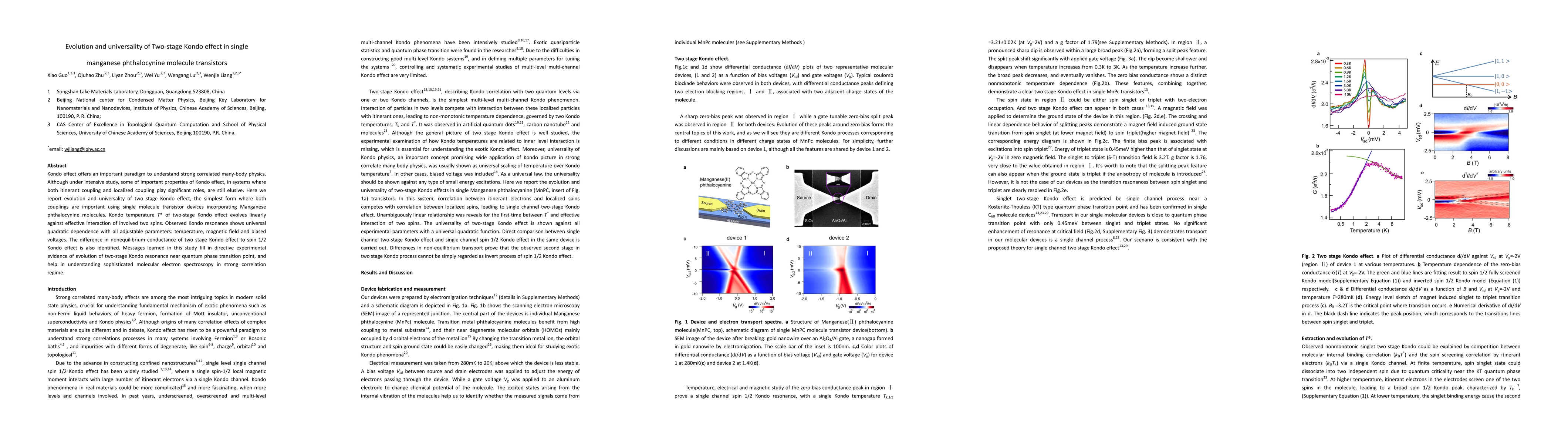 Kondo effect offers an important paradigm to understand strong correlated many-body physics. Although under intensive study, some of important properties of Kondo effect, in systems where both itinerant coupling and localized coupling play significant roles, are still elusive. Here we report evolution and universality of two stage Kondo effect, the simplest form where both couplings are important using single molecule transistor devices incorporating Manganese phthalocyanine molecules. Kondo temperature T* of two-stage Kondo effect evolves linearly against effective interaction of involved two spins. Observed Kondo resonance shows universal quadratic dependence with all adjustable parameters: temperature, magnetic field and biased voltages. The difference in nonequilibrium conductance of two stage Kondo effect to spin 1/2 Kondo effect is also identified. Messages learned in this study fill in directive experimental evidence of evolution of two-stage Kondo resonance near quantum phase transition point, and help in understanding sophisticated molecular electron spectroscopy in strong correlation regime.