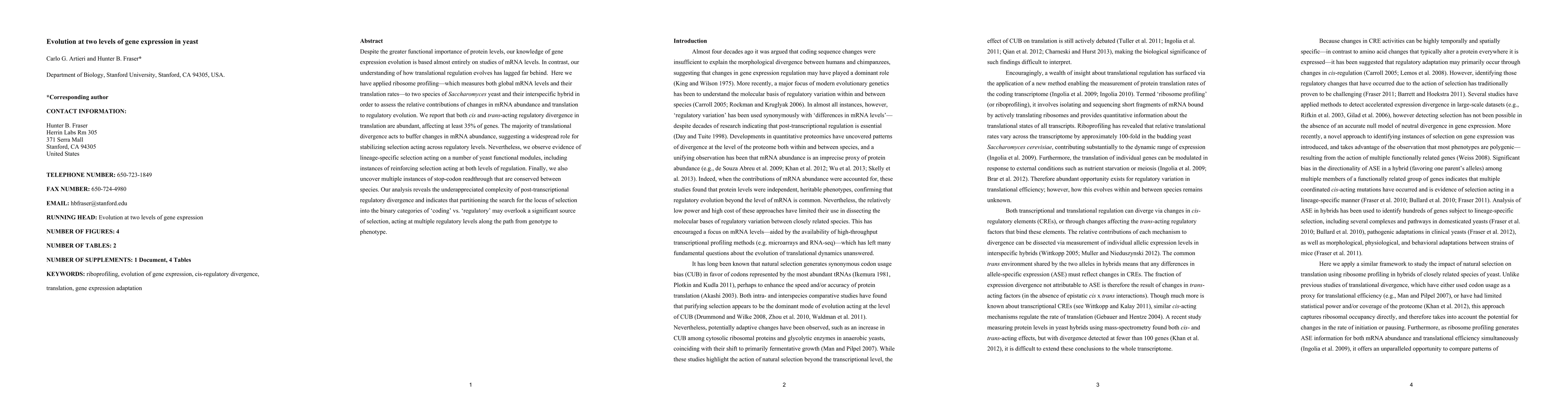 This study uses ribosome profiling to compare mRNA levels and translation rates in two Saccharomyces yeast species and their hybrid, revealing significant translational regulation evolution. It finds that both cis and trans-acting regulatory changes affect at least 35% of genes, often buffering mRNA abundance changes, while also identifying lineage-specific selection and conserved stop-codon readthrough.