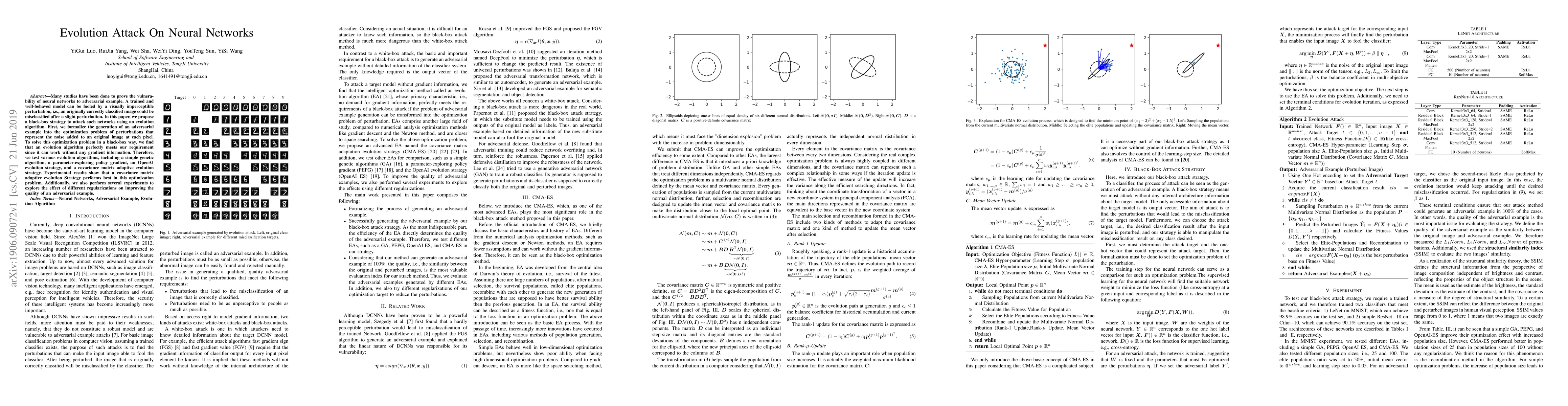This paper proposes a black-box strategy to attack neural networks using evolution algorithms, demonstrating that a Covariance Matrix Adaptation Evolution Strategy performs best. It also explores the impact of various regularizations on adversarial example quality.