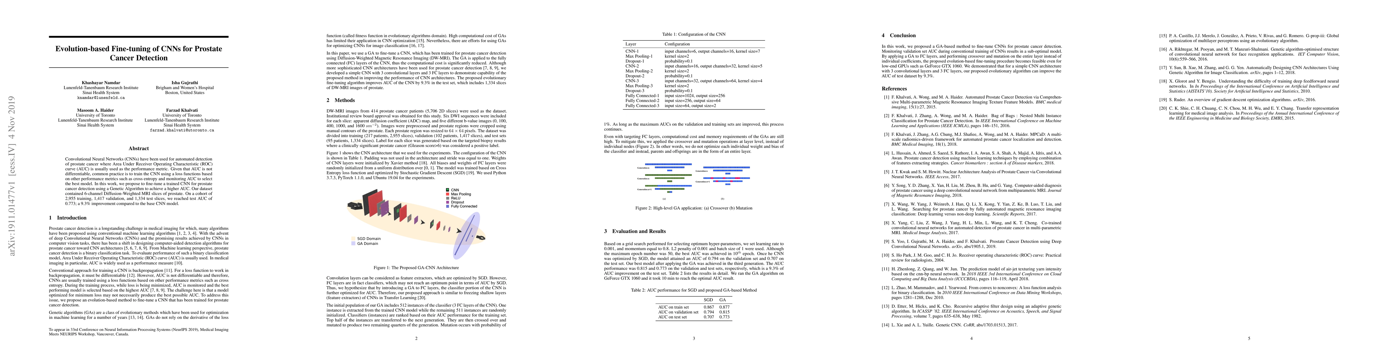 Convolutional Neural Networks (CNNs) have been used for automated detection of prostate cancer where Area Under Receiver Operating Characteristic (ROC) curve (AUC) is usually used as the performance metric. Given that AUC is not differentiable, common practice is to train the CNN using a loss functions based on other performance metrics such as cross entropy and monitoring AUC to select the best model. In this work, we propose to fine-tune a trained CNN for prostate cancer detection using a Genetic Algorithm to achieve a higher AUC. Our dataset contained 6-channel Diffusion-Weighted MRI slices of prostate. On a cohort of 2,955 training, 1,417 validation, and 1,334 test slices, we reached test AUC of 0.773; a 9.3% improvement compared to the base CNN model.