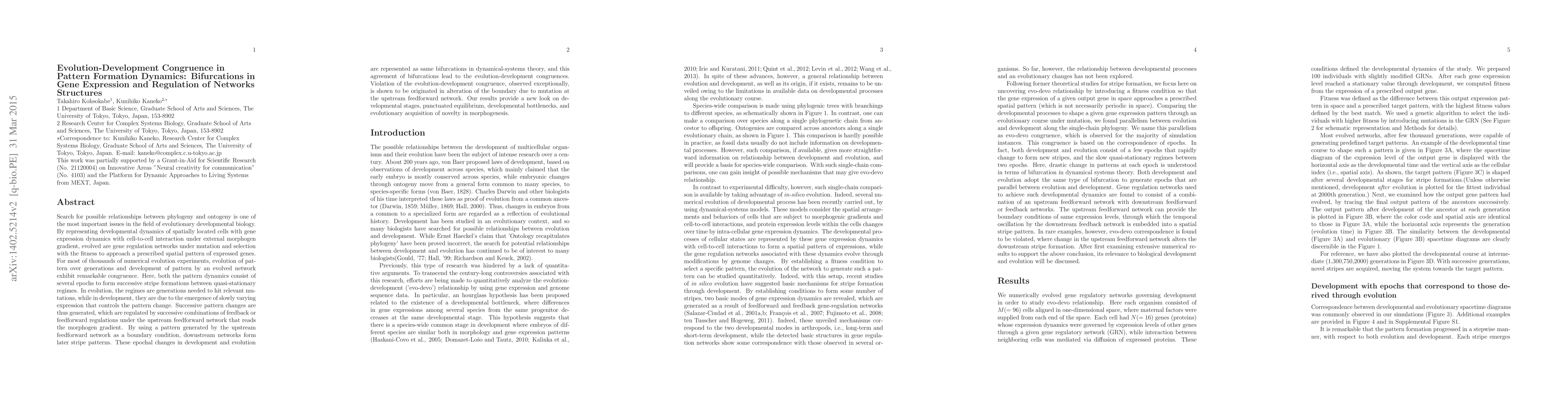 This research explores the connection between evolution and development in pattern formation, demonstrating remarkable congruence in gene expression dynamics and network structures over generations. By modeling developmental processes with gene expression under morphogen gradients, the study reveals that both evolution and development exhibit similar epochal changes, represented as bifurcations in dynamical systems theory. Violations in congruence are attributed to mutations in upstream feedforward networks, providing insights into developmental stages, punctuated equilibrium, and evolutionary acquisition of novelty in morphogenesis.