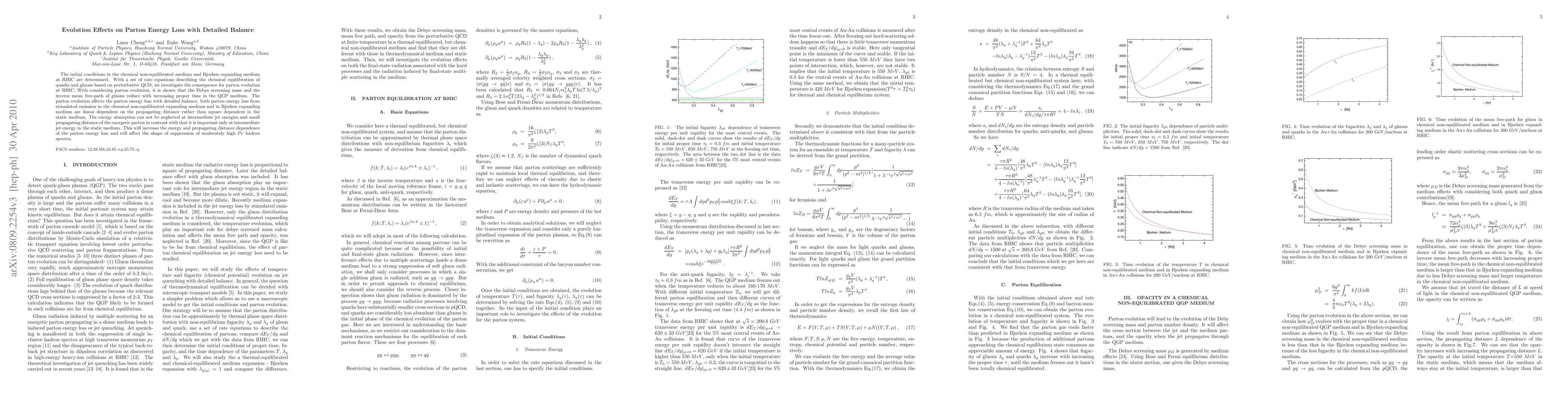 The initial conditions in the chemical non-equilibrated medium and Bjorken expanding medium at RHIC are determined. With a set of rate equations describing the chemical equilibration of quarks and gluons based on perturbative QCD, we investigate the consequence for parton evolution at RHIC. With considering parton evolution, it is shown that the Debye screening mass and the inverse mean free-path of gluons reduce with increasing proper time in the QGP medium. The parton evolution affects the parton energy loss with detailed balance, both parton energy loss from stimulated emission in the chemical non-equilibrated expanding medium and in Bjorken expanding medium are linear dependent on the propagating distance rather than square dependent in the static medium. The energy absorption can not be neglected at intermediate jet energies and small propagating distance of the energetic parton in contrast with that it is important only at intermediate jet energy in the static medium. This will increase the energy and propagating distance dependence of the parton energy loss and will affect the shape of suppression of moderately high P_T hadron spectra.