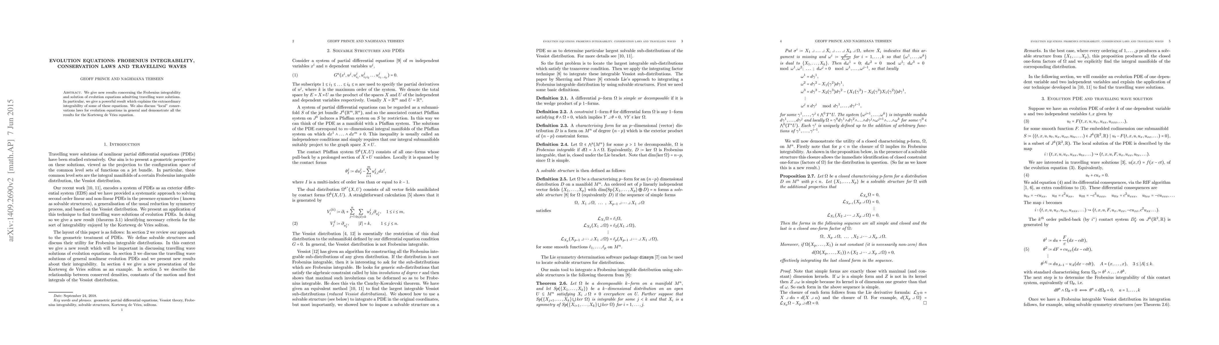 Summary: This paper explores the Frobenius integrability and travelling wave solutions of evolution equations, revealing a key mechanism behind their integrability. It also examines local conservation laws, exemplified through the Korteweg de Vries equation.