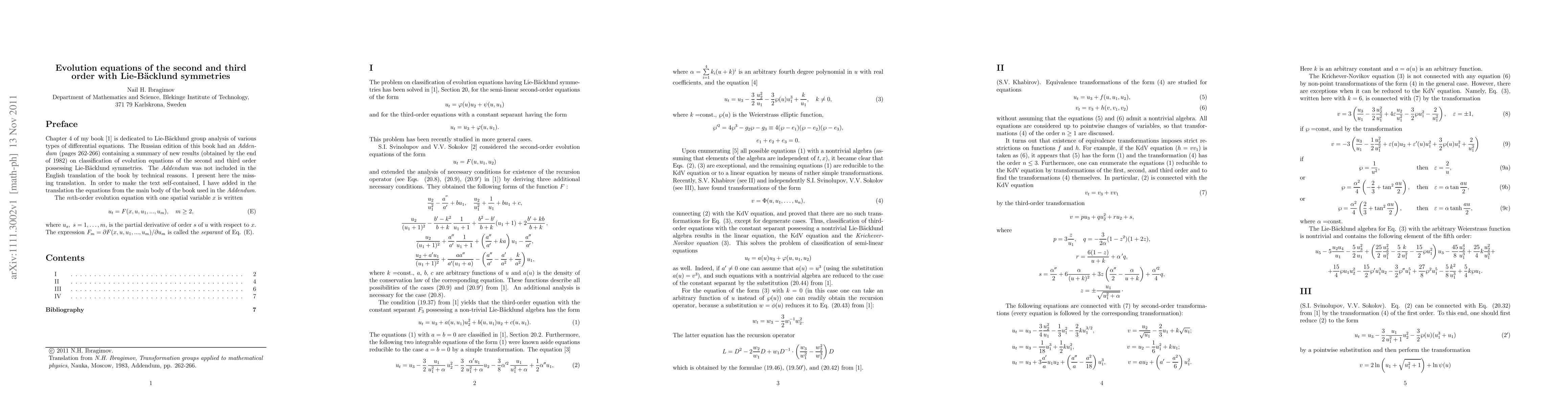 Chapter 4 of my book [1] is dedicated to Lie-B\"acklund group analysis of various types of differential equations. The Russian edition of this book had an Addendum (pages 262-266) containing a summary of new results (obtained by the end of 1982) on classification of evolution equations of the second and third order possessing Lie-B\"acklund symmetries. The \textit{Addendum} was not included in the English translation of the book by technical reasons. I present here the missing translation. In order to make the text self-contained, I have added in the translation the equations from the main body of the book used in the Addendum.