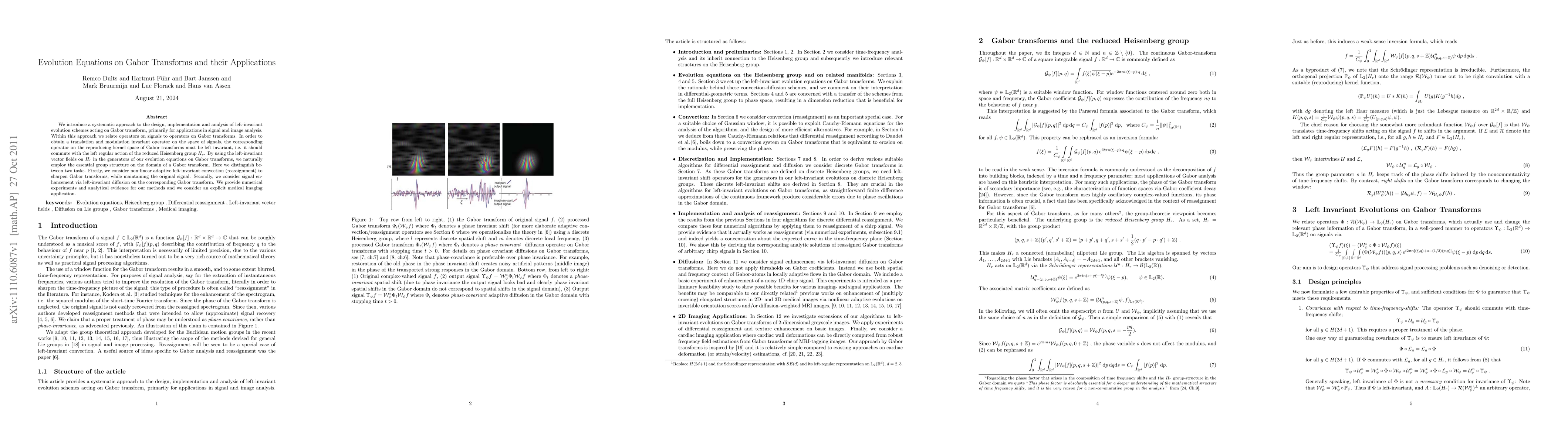 This paper develops left-invariant evolution schemes on Gabor transforms for signal and image analysis, focusing on non-linear adaptive convolution and left-invariant diffusion to enhance Gabor transforms. It provides numerical and analytical validation, including a medical imaging application.