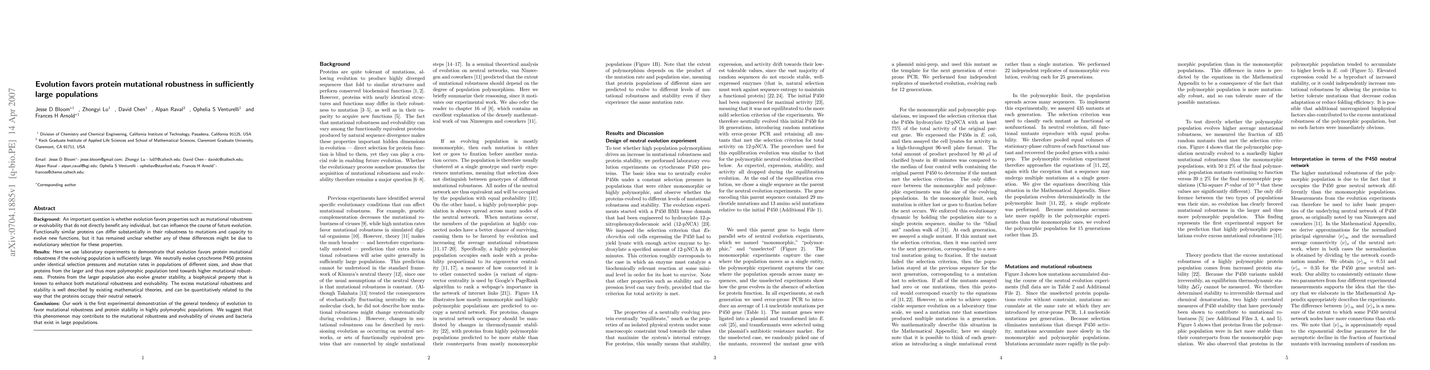 This study demonstrates that evolution favors protein mutational robustness in sufficiently large populations through laboratory experiments on cytochrome P450 proteins. Proteins from larger, more polymorphic populations exhibit greater mutational robustness and stability, supporting the idea that large population sizes can enhance these evolutionary properties.