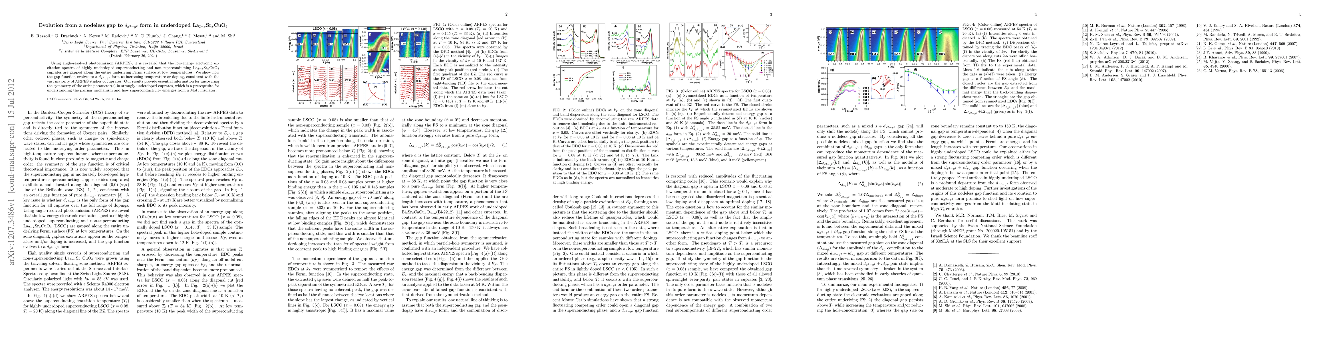 This paper uses ARPES to demonstrate that the electronic excitation spectra in underdoped La(2-x)SrxCuO4 exhibit a gap that evolves from a nodeless state to a d(x2-y2) form with increased temperature or doping. These findings are crucial for understanding the symmetry of the order parameter in cuprates and the underlying superconductivity mechanism.