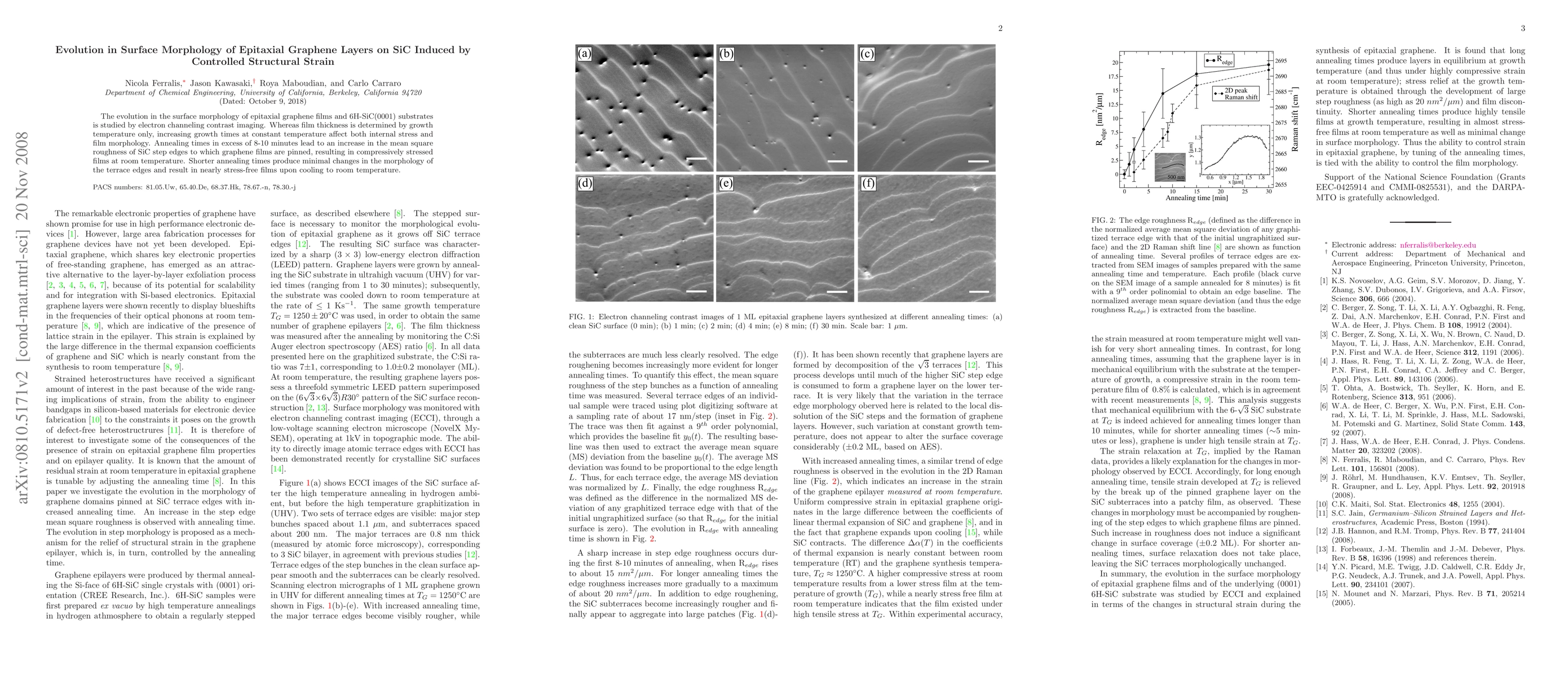 The evolution in the surface morphology of epitaxial graphene films and 6H-SiC(0001) substrates is studied by electron channeling contrast imaging. Whereas film thickness is determined by growth temperature only, increasing growth times at constant temperature affect both internal stress and film morphology. Annealing times in excess of 8-10 minutes lead to an increase in the mean square roughness of SiC step edges to which graphene films are pinned, resulting in compressively stressed films at room temperature. Shorter annealing times produce minimal changes in the morphology of the terrace edges and result in nearly stress-free films upon cooling to room temperature.