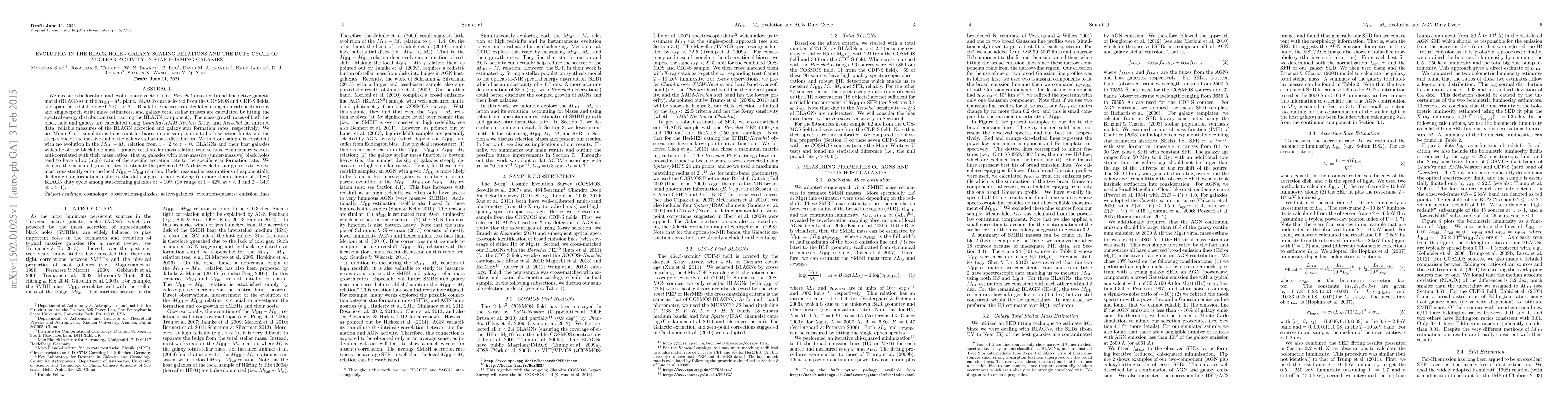 We measure the location and evolutionary vectors of 69 Herschel-detected broad-line active galactic nuclei (BLAGNs) in the M_BH-M_* plane. BLAGNs are selected from the COSMOS and CDF-S fields, and span the redshift range 0.2< z<2.1. Black-hole masses are calculated using archival spectroscopy and single-epoch virial mass estimators, and galaxy total stellar masses are calculated by fitting the spectral energy distribution (subtracting the BLAGN component). The mass-growth rates of both the black hole and galaxy are calculated using Chandra/XMM-Newton X-ray and Herschel far-infrared data, reliable measures of the BLAGN accretion and galaxy star formation rates, respectively. We use Monte Carlo simulations to account for biases in our sample, due to both selection limits and the steep slope of the massive end of the galaxy stellar-mass distribution. We find our sample is consistent with no evolution in the M_BH-M_* relation from z~2 to z~0. BLAGNs and their host galaxies which lie off the black hole mass galaxy total stellar mass relation tend to have evolutionary vectors anti-correlated with their mass ratios: that is, galaxies with over-massive (under-massive) black holes tend to have a low (high) ratio of the specific accretion rate to the specific star formation rate. We also use the measured growth rates to estimate the preferred AGN duty cycle for our galaxies to evolve most consistently onto the local M_BH-M_Bul relation. Under reasonable assumptions of exponentially declining star formation histories, the data suggest a non-evolving (no more than a factor of a few) BLAGN duty cycle among star-forming galaxies of 10% (1sigma range of 1-42% at z<1 and 2-34% at z>1).