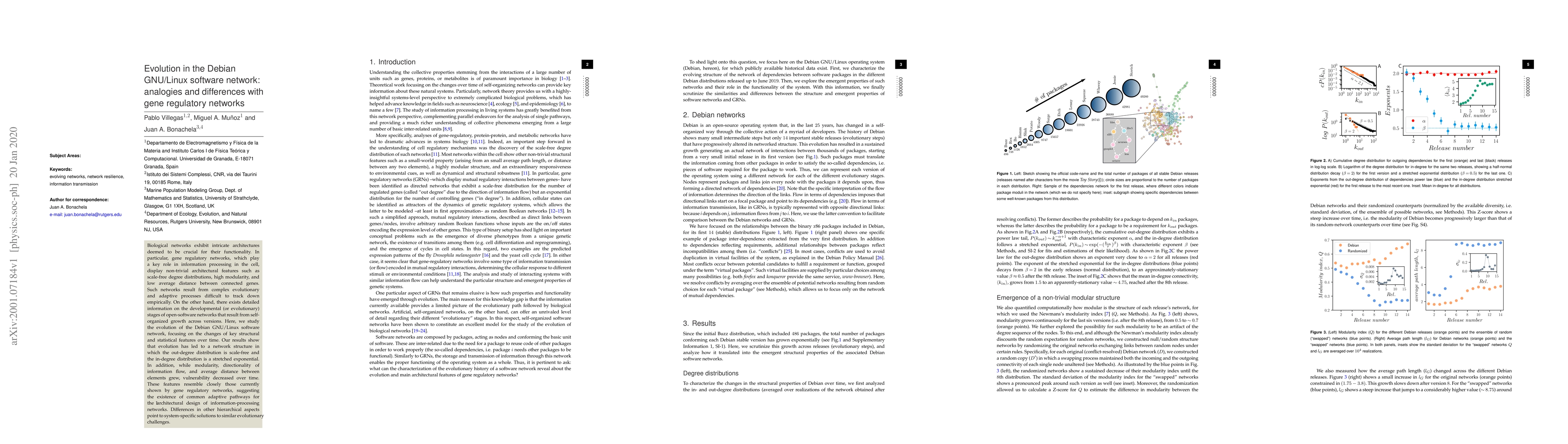 Biological networks exhibit intricate architectures deemed to be crucial for their functionality. In particular, gene regulatory networks, which play a key role in information processing in the cell, display non-trivial architectural features such as scale-free degree distributions, high modularity, and low average distance between connected genes. Such networks result from complex evolutionary and adaptive processes difficult to track down empirically. On the other hand, there exists detailed information on the developmental (or evolutionary) stages of open-software networks that result from self-organized growth across versions. Here, we study the evolution of the Debian GNU/Linux software network, focusing on the changes of key structural and statistical features over time. Our results show that evolution has led to a network structure in which the out-degree distribution is scale-free and the in-degree distribution is a stretched exponential. In addition, while modularity, directionality of information flow, and average distance between elements grew, vulnerability decreased over time. These features resemble closely those currently shown by gene regulatory networks, suggesting the existence of common adaptive pathways for the architectural design of information-processing networks. Differences in other hierarchical aspects point to system-specific solutions to similar evolutionary challenges.