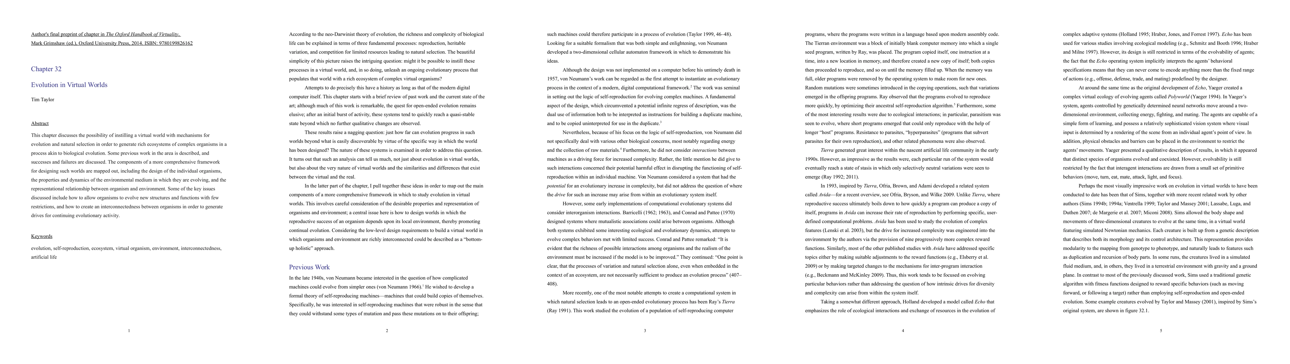This chapter discusses the possibility of instilling a virtual world with mechanisms for evolution and natural selection in order to generate rich ecosystems of complex organisms in a process akin to biological evolution. Some previous work in the area is described, and successes and failures are discussed. The components of a more comprehensive framework for designing such worlds are mapped out, including the design of the individual organisms, the properties and dynamics of the environmental medium in which they are evolving, and the representational relationship between organism and environment. Some of the key issues discussed include how to allow organisms to evolve new structures and functions with few restrictions, and how to create an interconnectedness between organisms in order to generate drives for continuing evolutionary activity.