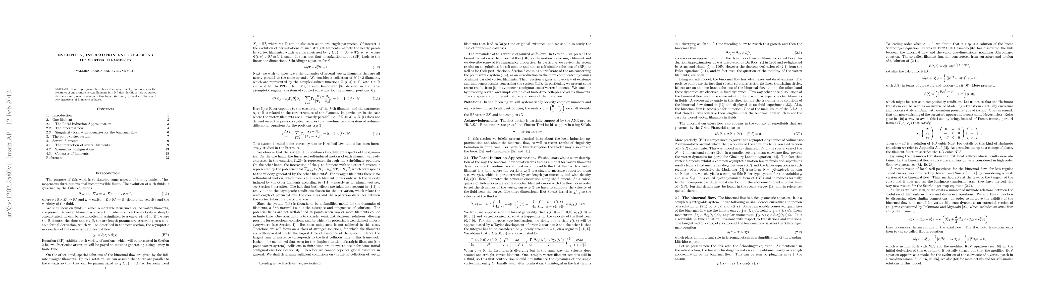 Several progresses have been done very recently on models for the dynamics of one or more vortex filaments in three-dimensional fluids. In this article we survey the recent and previous results in this topic. We also present some new situations of filaments collapse.