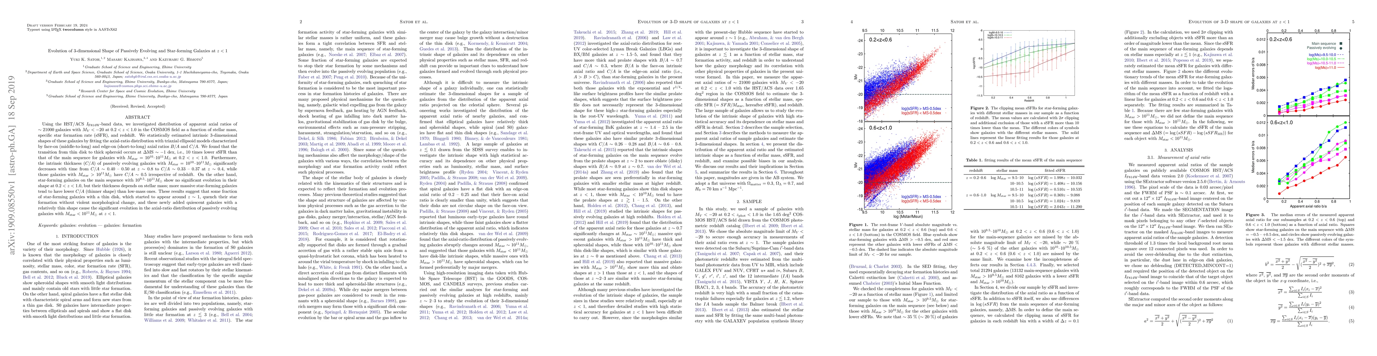 This study analyzes the 3-dimensional shapes of galaxies in the COSMOS field using HST/ACS data, finding that passive galaxies transition from thin disks to thick spheroids at a lower specific star formation rate (sSFR). The intrinsic thickness of these galaxies decreases over time, while star-forming galaxies maintain their shape, suggesting that the evolution in passive galaxies' shapes is driven by the addition of quenched, thin-disk galaxies.
