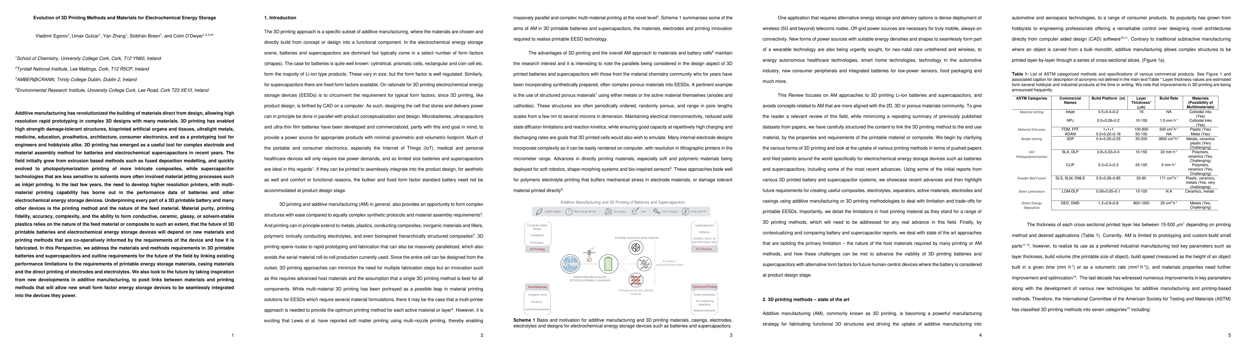 This paper reviews the evolution of 3D printing methods and materials for electrochemical energy storage, highlighting the transition from extrusion-based to photopolymerization techniques. It emphasizes the importance of material purity and printing fidelity for the development of advanced 3D printable batteries and supercapacitors, and discusses future directions for innovation in this field.
