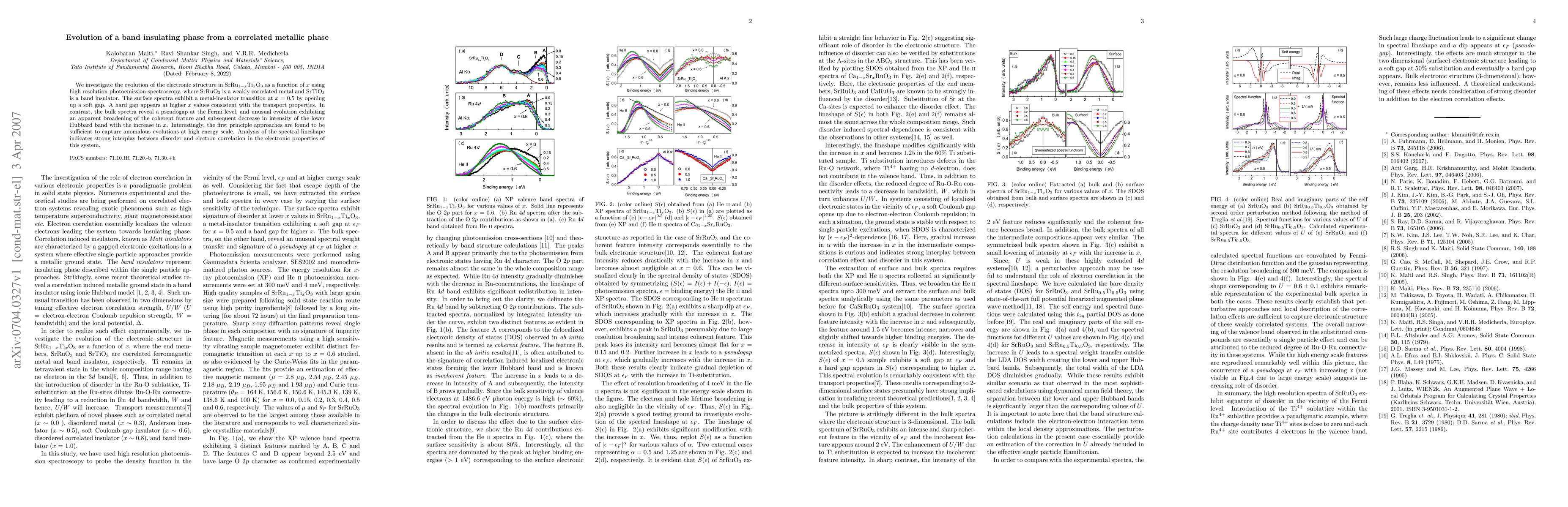 We investigate the evolution of the electronic structure in SrRu_(1-x)Ti_xO_3 as a function of x using high resolution photoemission spectroscopy, where SrRuO3 is a weakly correlated metal and SrTiO3 is a band insulator. The surface spectra exhibit a metal-insulator transition at x = 0.5 by opening up a soft gap. A hard gap appears at higher x values consistent with the transport properties. In contrast, the bulk spectra reveal a pseudogap at the Fermi level, and unusual evolution exhibiting an apparent broadening of the coherent feature and subsequent decrease in intensity of the lower Hubbard band with the increase in x. Interestingly, the first principle approaches are found to be sufficient to capture anomalous evolutions at high energy scale. Analysis of the spectral lineshape indicates strong interplay between disorder and electron correlation in the electronic properties of this system.