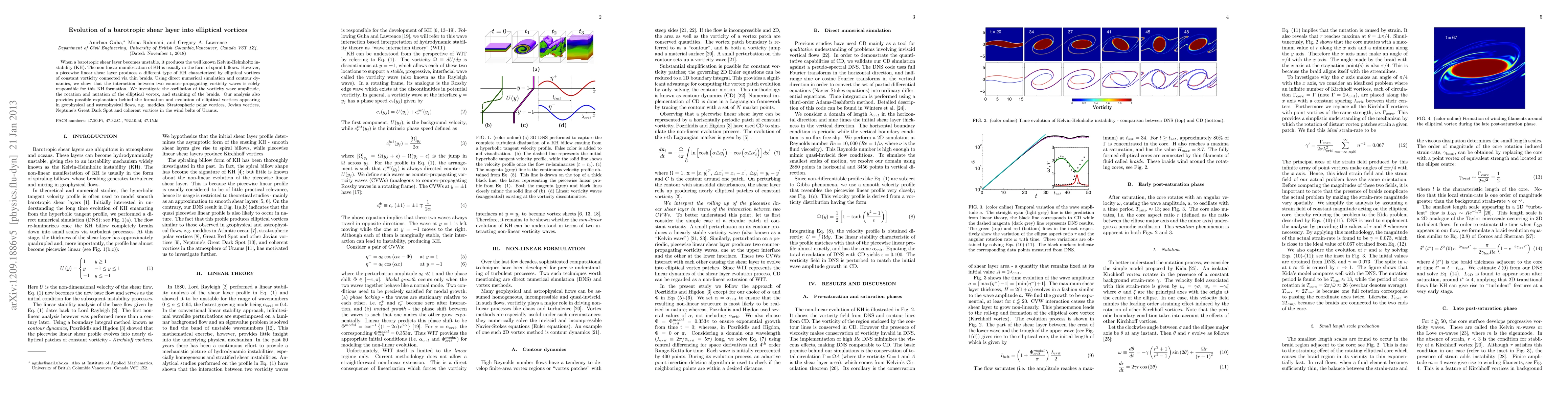 This paper investigates the evolution of a barotropic shear layer into elliptical vortices through the Kelvin-Helmholtz instability, revealing that counter-propagating vorticity waves drive the formation of these vortices. The study uses direct numerical simulation and contour dynamics to explore the dynamics of elliptical vortex formation and its implications for geophysical and astrophysical phenomena.