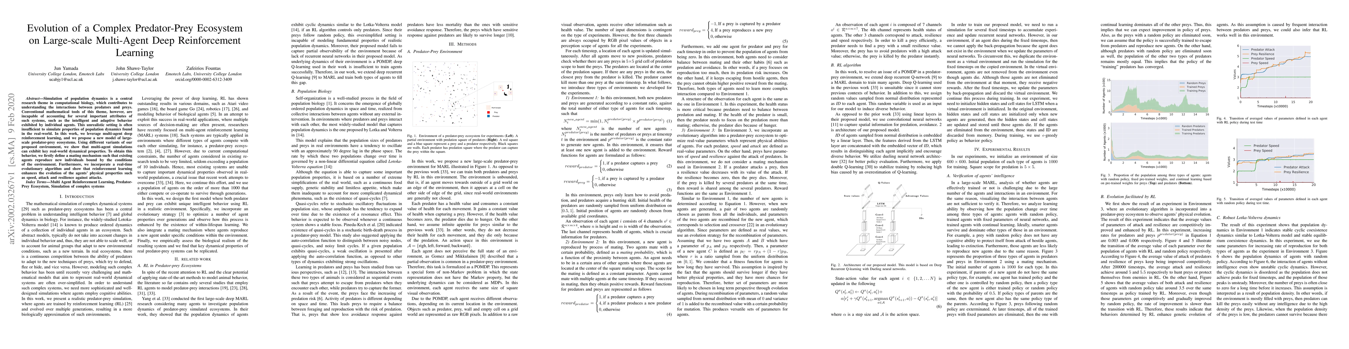 Simulation of population dynamics is a central research theme in computational biology, which contributes to understanding the interactions between predators and preys. Conventional mathematical tools of this theme, however, are incapable of accounting for several important attributes of such systems, such as the intelligent and adaptive behavior exhibited by individual agents. This unrealistic setting is often insufficient to simulate properties of population dynamics found in the real-world. In this work, we leverage multi-agent deep reinforcement learning, and we propose a new model of large-scale predator-prey ecosystems. Using different variants of our proposed environment, we show that multi-agent simulations can exhibit key real-world dynamical properties. To obtain this behavior, we firstly define a mating mechanism such that existing agents reproduce new individuals bound by the conditions of the environment. Furthermore, we incorporate a real-time evolutionary algorithm and show that reinforcement learning enhances the evolution of the agents' physical properties such as speed, attack and resilience against attacks.