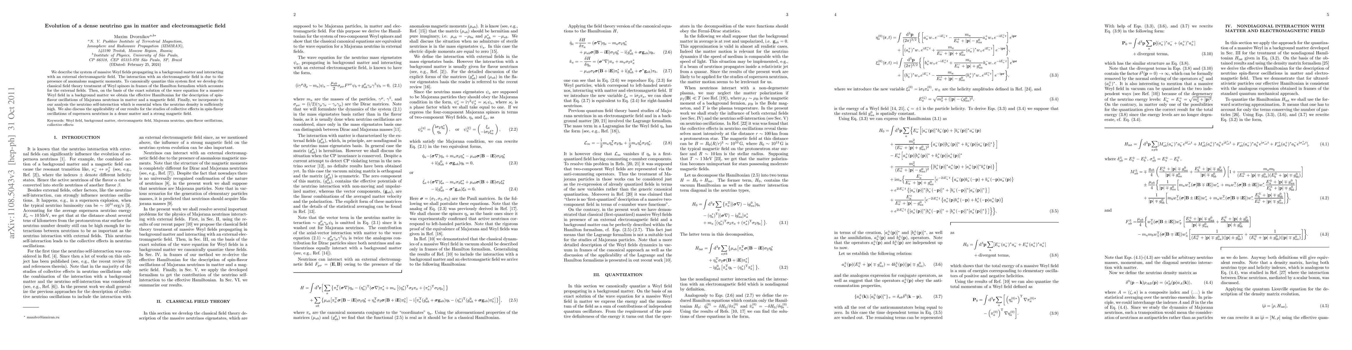 We describe the system of massive Weyl fields propagating in a background matter and interacting with an external electromagnetic field. The interaction with an electromagnetic field is due to the presence of anomalous magnetic moments. To canonically quantize this system first we develop the classical field theory treatment of Weyl spinors in frames of the Hamilton formalism which accounts for the external fields. Then, on the basis of the exact solution of the wave equation for a massive Weyl field in a background matter we obtain the effective Hamiltonian for the description of spin-flavor oscillations of Majorana neutrinos in matter and a magnetic field. Finally, we incorporate in our analysis the neutrino self-interaction which is essential when the neutrino density is sufficiently high. We also discuss the applicability of our results for the studies of collective effects in spin-flavor oscillations of supernova neutrinos in a dense matter and a strong magnetic field.