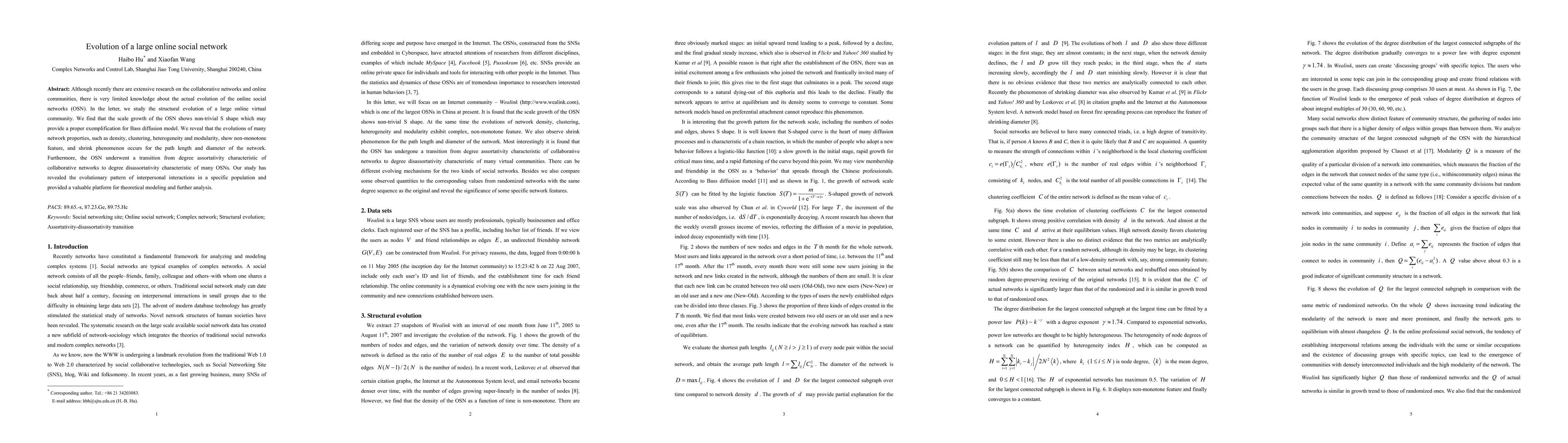 This paper investigates the structural evolution of a large online social network, finding its scale growth follows a non-trivial S shape, akin to the Bass diffusion model. The study reveals complex, non-monotone changes in network properties, including a shrinking phenomenon in path length and diameter, and a transition from degree assortativity to disassortativity.