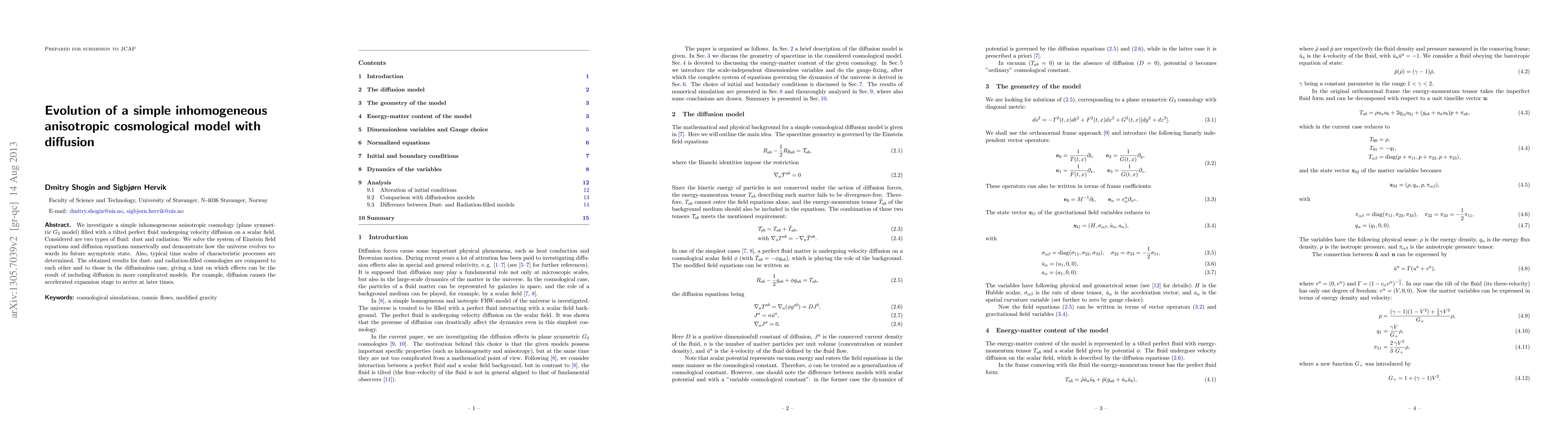 We investigate a simple inhomogeneous anisotropic cosmology (plane symmetric $G_2$ model) filled with a tilted perfect fluid undergoing velocity diffusion on a scalar field. Considered are two types of fluid: dust and radiation. We solve the system of Einstein field equations and diffusion equations numerically and demonstrate how the universe evolves towards its future asymptotic state. Also, typical time scales of characteristic processes are determined. The obtained results for dust- and radiation-filled cosmologies are compared to each other and to those in the diffusionless case, giving a hint on which effects can be the result of including diffusion in more complicated models. For example, diffusion causes the accelerated expansion stage to arrive at later times.