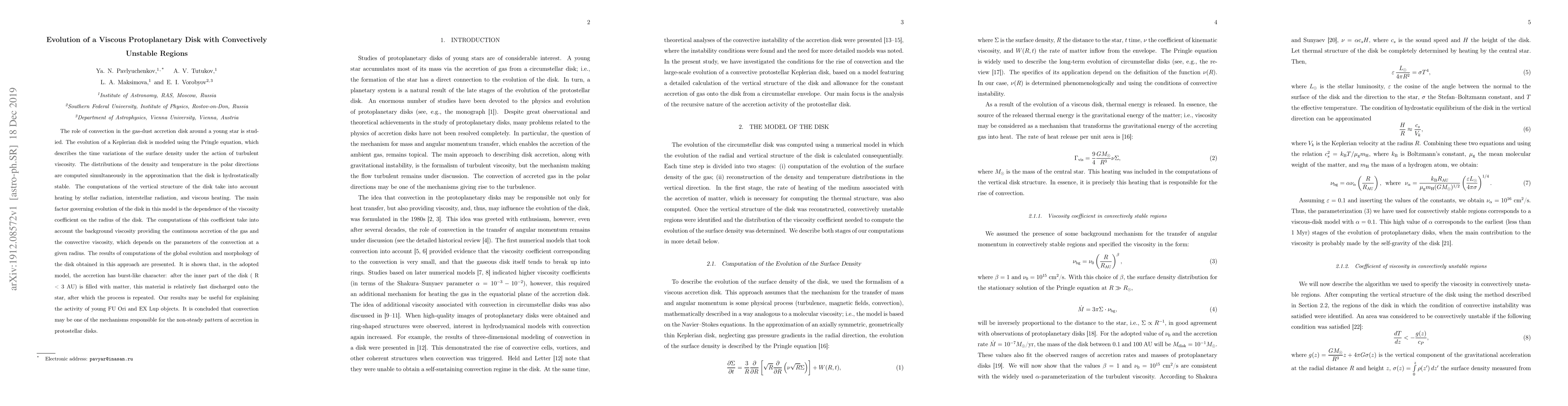 This paper models the evolution of a viscous protoplanetary disk with convectively unstable regions, showing that accretion occurs in burst-like cycles due to the interplay between background and convective viscosity. The findings suggest convection as a mechanism for the non-steady accretion pattern observed in young FU Ori and EX Lup objects.