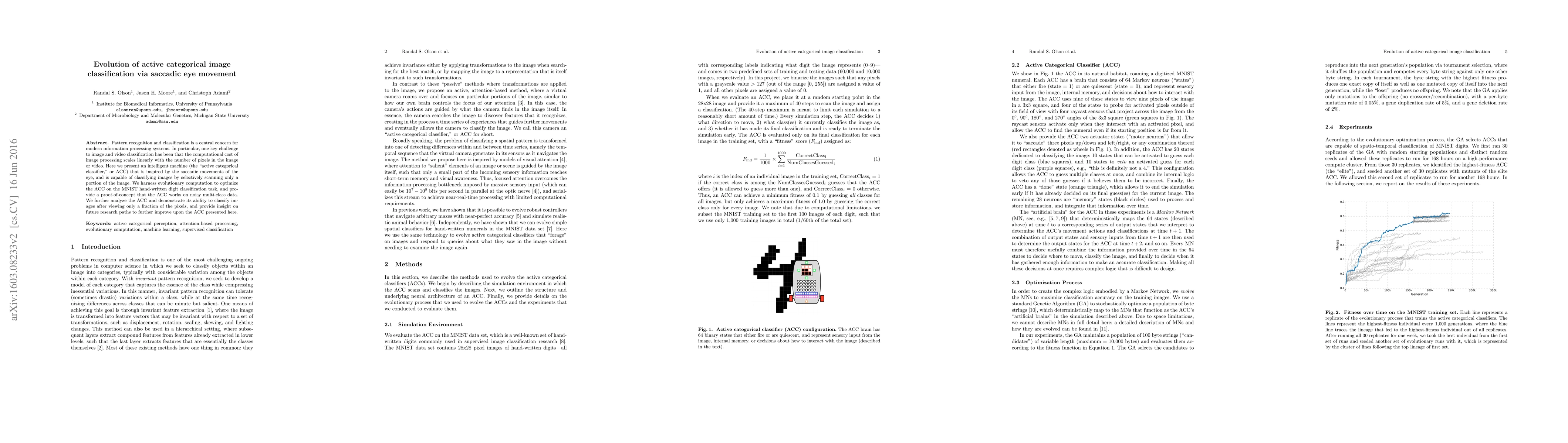 This paper introduces an "active categorical classifier" (ACC) inspired by saccadic eye movements, which selectively scans parts of an image to classify it, significantly reducing computational costs. The ACC is optimized using evolutionary computation for the MNIST digit classification task, demonstrating its effectiveness on noisy multi-class data.