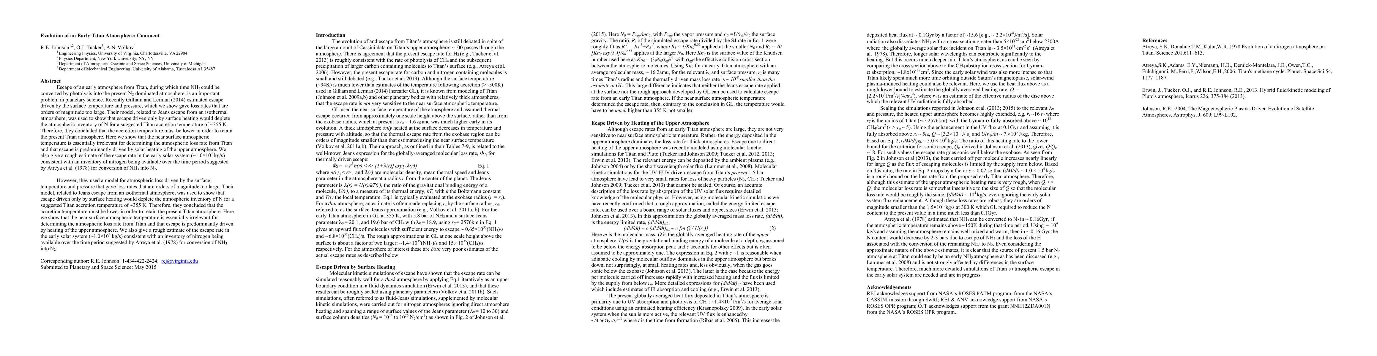 Escape of an early atmosphere from Titan, during which time NH3 could be converted by photolysis into the present N2 dominated atmosphere, is an important problem in planetary science. Recently Gilliam and Lerman (2014) estimated escape driven by the surface temperature and pressure, which we show gave loss rates that are orders of magnitude too large. Their model, related to Jeans escape from an isothermal atmosphere, was used to show that escape driven only by surface heating would deplete the atmospheric inventory of N for a suggested Titan accretion temperature of ~355 K. Therefore, they concluded that the accretion temperature must be lower in order to retain the present Titan atmosphere. Here we show that the near surface atmospheric temperature is essentially irrelevant for determining the atmospheric loss rate from Titan and that escape is predominantly driven by solar heating of the upper atmosphere. We also give a rough estimate of the escape rate in the early solar system (~10^4 kg/s) consistent with an inventory of nitrogen being available over the time period suggested by Atreya et al. (1978) for conversion of NH3 into N2.
