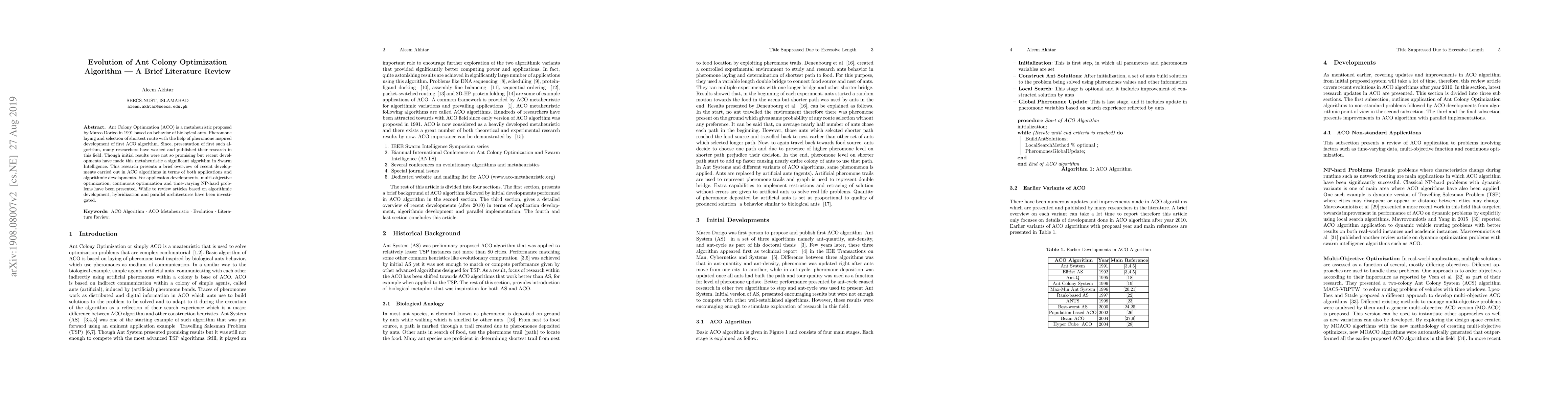 This paper provides a concise review of the evolution of the Ant Colony Optimization (ACO) algorithm, highlighting significant advancements in both applications and algorithmic developments since its inception in 1991. It covers recent progress in multi-objective, continuous optimization, and hybridized parallel architectures.