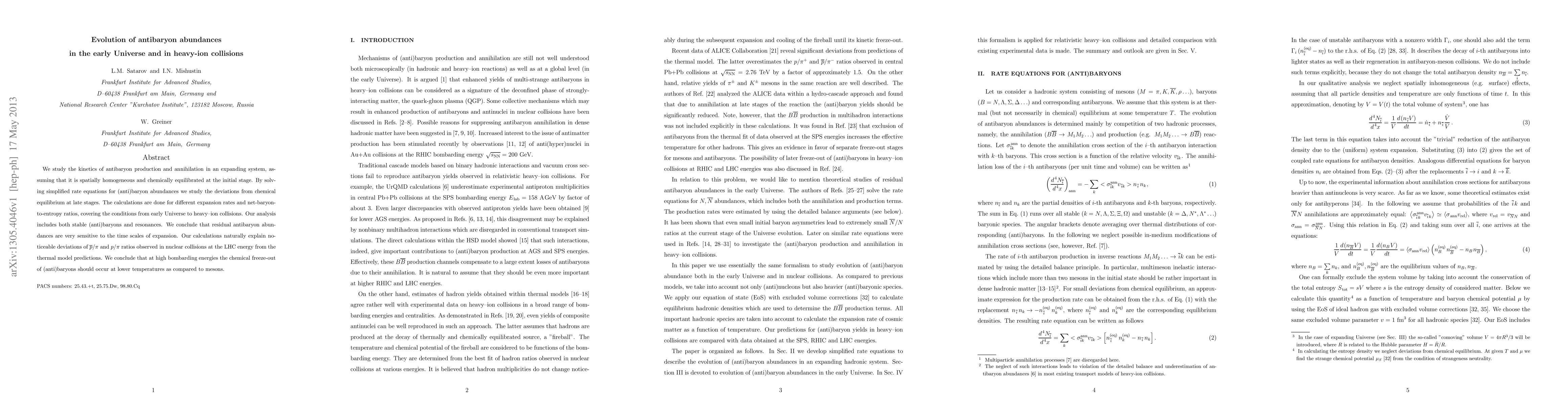 This paper investigates the dynamics of antibaryon production and annihilation in expanding systems, revealing that residual antibaryon abundances are highly sensitive to the expansion timescales. The study explains observed deviations in antiproton-to-pion and proton-to-pion ratios in high-energy nuclear collisions, suggesting chemical freeze-out occurs at lower temperatures for (anti)baryons compared to mesons.