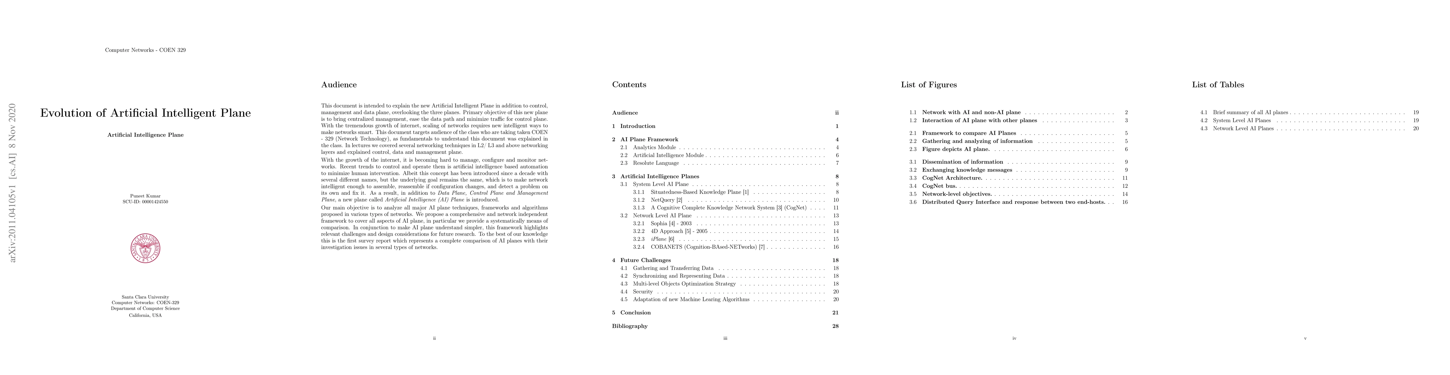This paper surveys the evolution of artificial intelligence in network management, proposing a comprehensive framework to analyze AI plane techniques, frameworks, and algorithms across various networks. It highlights key challenges and design considerations for future research, marking a significant milestone in understanding AI planes.