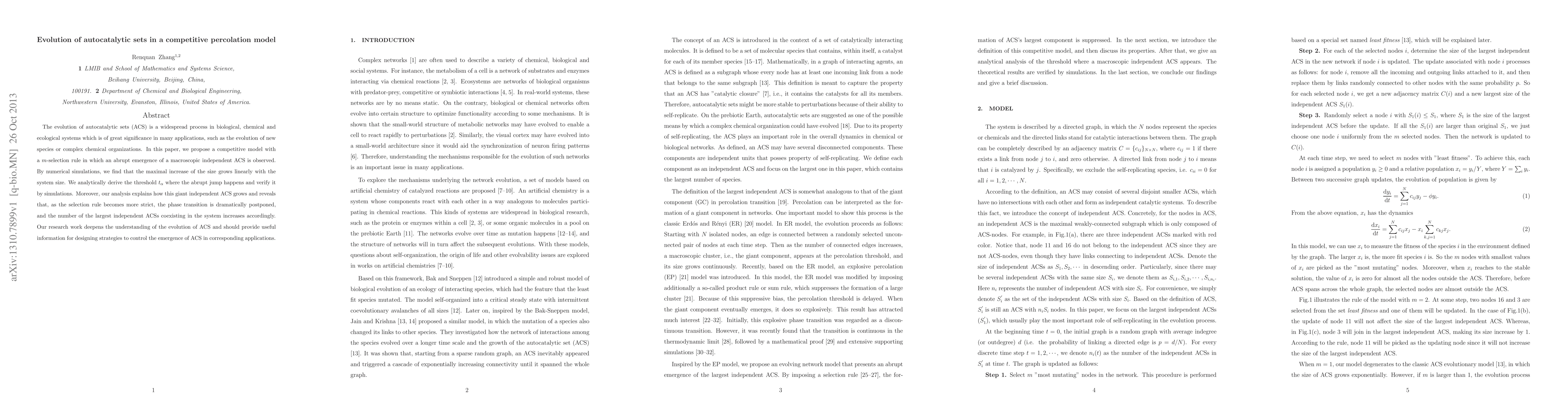 This paper proposes a competitive percolation model to study the evolution of autocatalytic sets (ACS), revealing an abrupt emergence of a macroscopic independent ACS. Numerical simulations show a linear growth of ACS size with system size, and analytical derivations confirm the threshold for this transition, highlighting how stricter selection rules delay the phase transition and increase the number of coexisting ACSs.