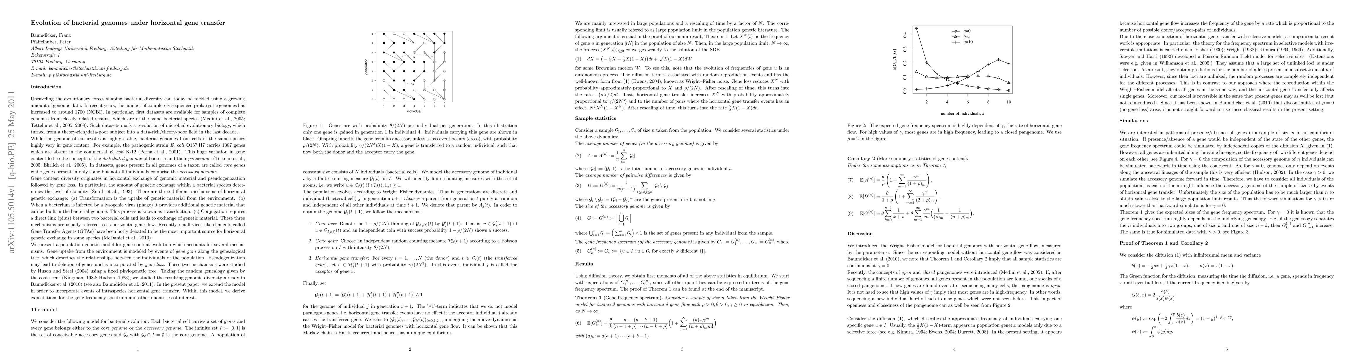 This research extends a population genetic model to incorporate horizontal gene transfer, exploring how gene gain, pseudogenization, and interspecies gene transfer influence bacterial genome evolution and contribute to genomic diversity. The model provides expectations for gene frequency distributions and other genomic metrics.