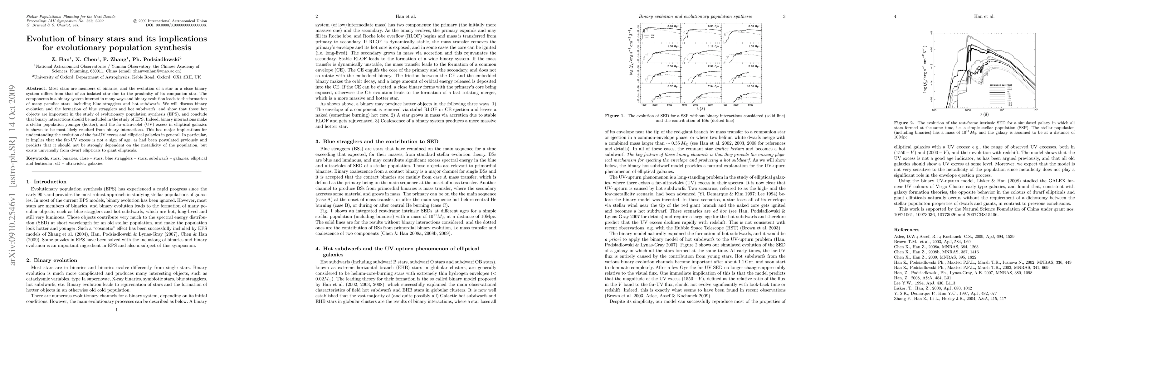 This paper explores the evolution of binary stars and highlights their significance in evolutionary population synthesis (EPS). It emphasizes that binary interactions lead to the formation of peculiar stars like blue stragglers and hot subdwarfs, which are crucial for understanding the far-ultraviolet excess in elliptical galaxies, challenging previous age-related assumptions.