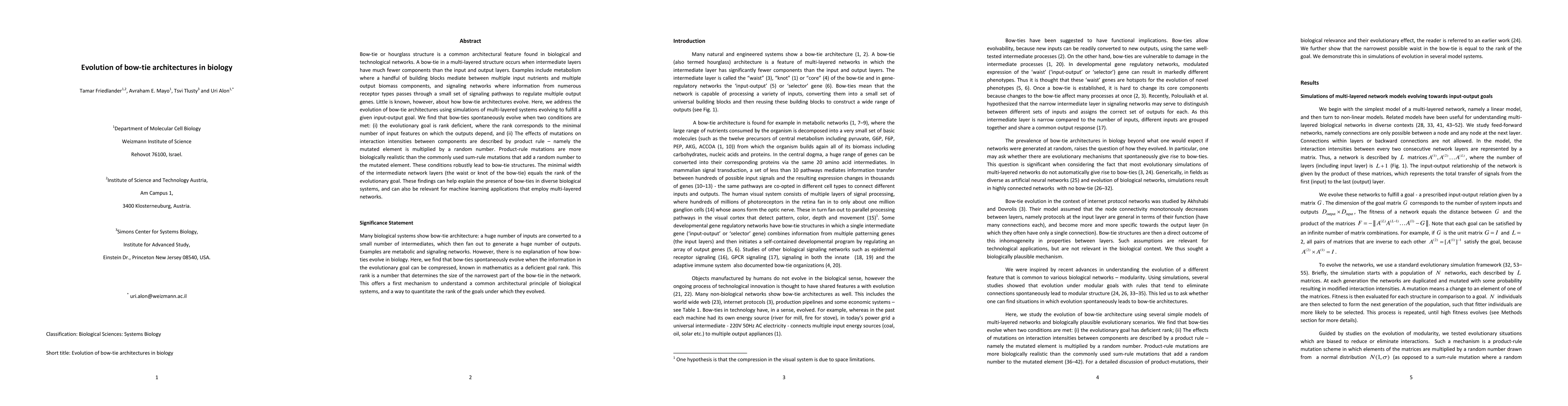 This paper explores the evolution of bow-tie architectures in biological systems, revealing that they spontaneously develop under specific conditions: rank-deficient evolutionary goals and product-rule mutations, which are more biologically plausible than sum-rule mutations. These findings provide insights into the natural occurrence of bow-tie structures in various biological networks.