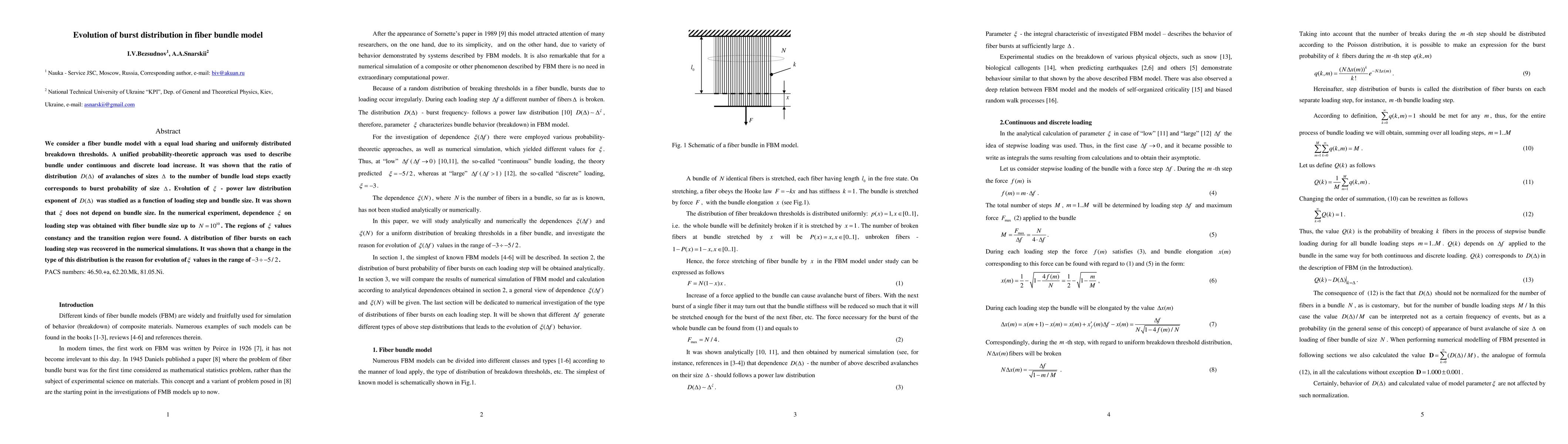 This paper investigates the evolution of burst distribution in a fiber bundle model under continuous and discrete load increases, revealing a s-power law distribution exponent that remains independent of bundle size. Numerical simulations identified regions of s constancy and transition, showing that changes in burst distribution types drive the evolution of s values within the range of -3 to -5/2.
