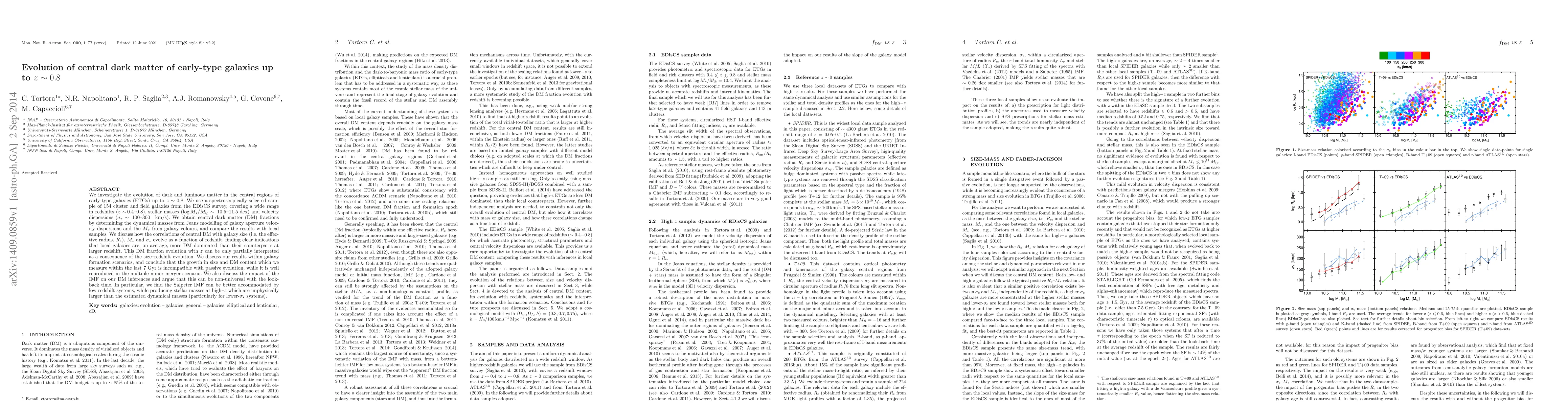 We investigate the evolution of dark and luminous matter in the central regions of early-type galaxies (ETGs) up to z ~ 0.8. We use a spectroscopically selected sample of 154 cluster and field galaxies from the EDisCS survey, covering a wide range in redshifts (z ~ 0.4-0.8), stellar masses ($\log M_{\star}/ M_{\odot}$ ~ 10.5-11.5 dex) and velocity dispersions ($\sigma_{\star}$ ~ 100-300 \, km/s). We obtain central dark matter (DM) fractions by determining the dynamical masses from Jeans modelling of galaxy aperture velocity dispersions and the $M_{\star}$ from galaxy colours, and compare the results with local samples. We discuss how the correlations of central DM with galaxy size (i.e. the effective radius, $R_{\rm e}$), $M_{\star}$ and $\sigma_{\star}$ evolve as a function of redshift, finding clear indications that local galaxies are, on average, more DM dominated than their counterparts at larger redshift. This DM fraction evolution with $z$ can be only partially interpreted as a consequence of the size-redshift evolution. We discuss our results within galaxy formation scenarios, and conclude that the growth in size and DM content which we measure within the last 7 Gyr is incompatible with passive evolution, while it is well reproduced in the multiple minor merger scenario. We also discuss the impact of the IMF on our DM inferences and argue that this can be non-universal with the lookback time. In particular, we find the Salpeter IMF can be better accommodated by low redshift systems, while producing stellar masses at high-$z$ which are unphysically larger than the estimated dynamical masses (particularly for lower-$\sigma_{\star}$ systems).