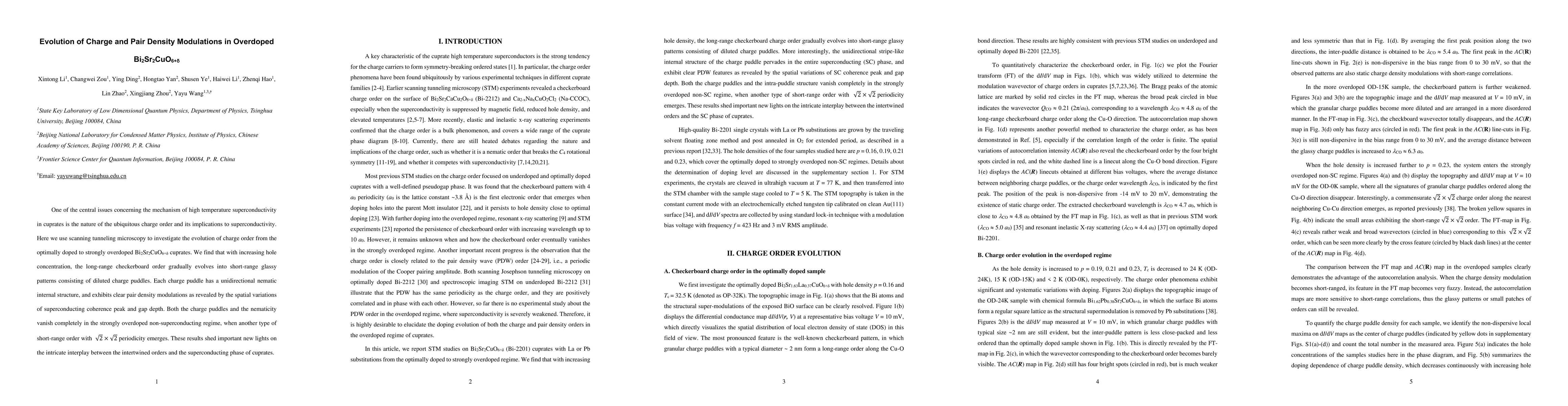 Researchers used scanning tunneling microscopy to study charge order in overdoped Bi2Sr2CuO6+delta cuprates, finding that charge order changes from long-range to short-range glassy patterns with increasing hole concentration. These patterns exhibit pair density modulations and either disappear or emerge into a new root2 * root2 periodicity in the strongly overdoped regime.