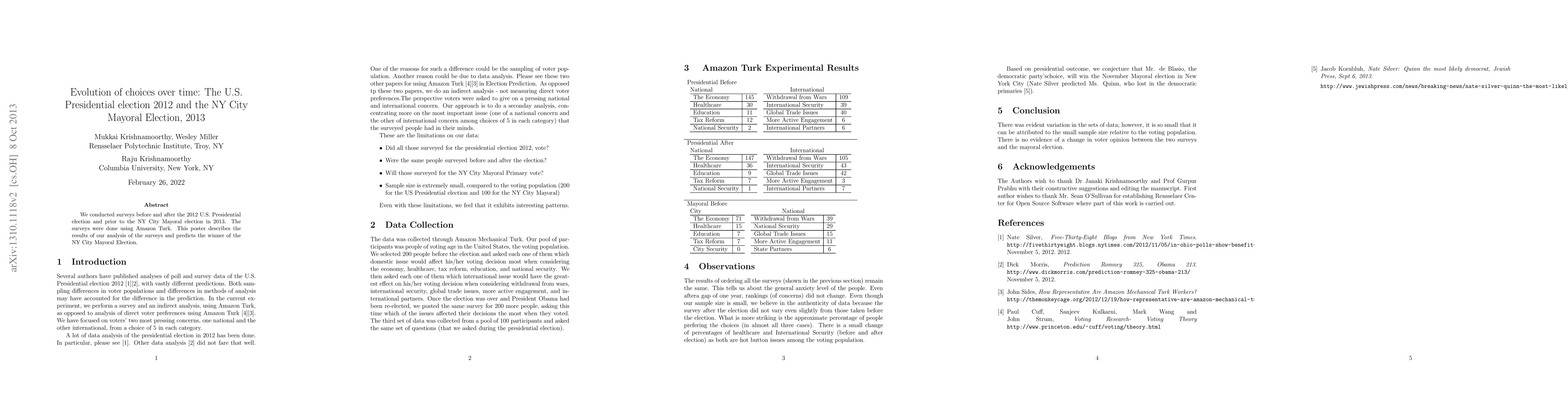Summary: This study analyzes survey data collected via Amazon Turk before and after the 2012 U.S. Presidential election and before the 2013 NY City Mayoral Election to explore changes in voter choices and predict the mayoral election outcome. The findings provide insights into the evolution of electoral preferences over time.