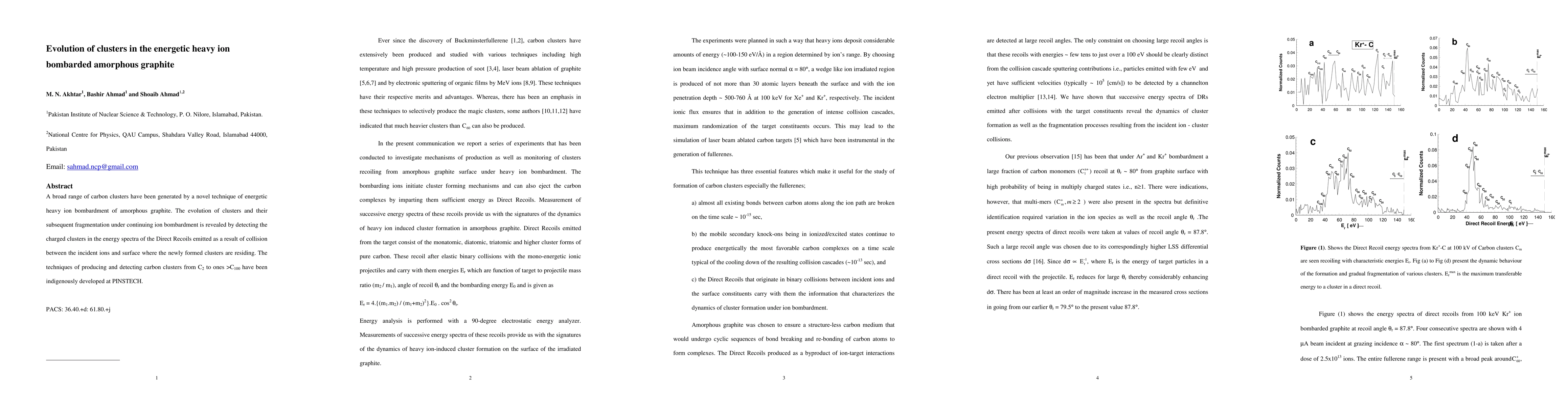 This study investigates the formation and fragmentation of carbon clusters in amorphous graphite under energetic heavy ion bombardment, revealing the dynamic evolution of clusters through analysis of emitted recoil spectra. The research highlights the mechanisms of cluster formation and subsequent fragmentation processes.