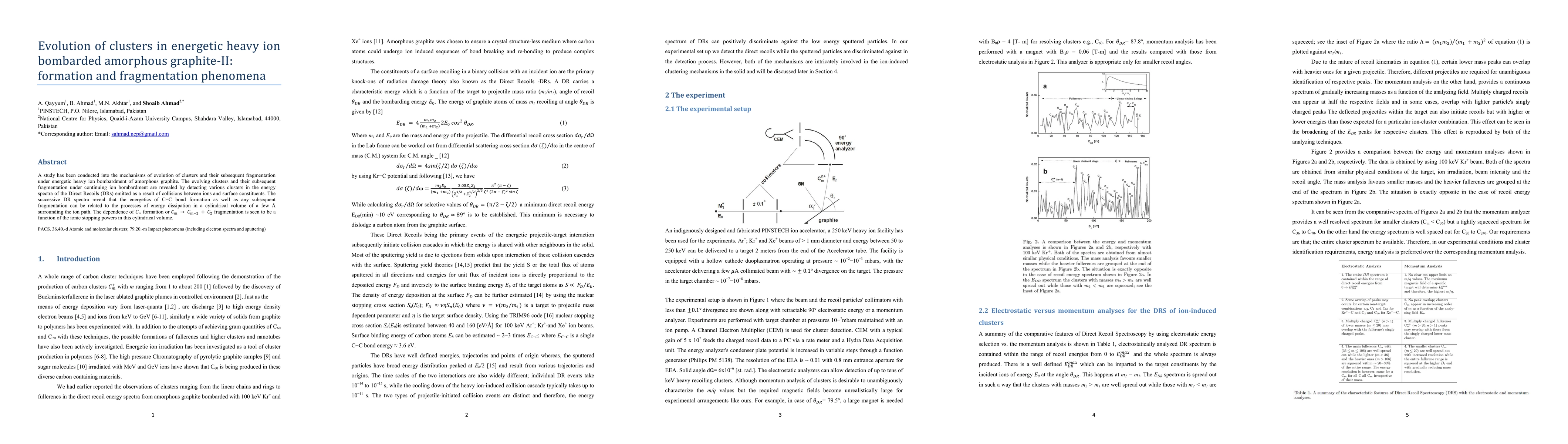 A study has been conducted into the mechanisms of evolution of clusters and their subsequent fragmentation under energetic heavy ion bombardment of amorphous graphite. The evolving clusters and their subsequent fragmentation under continuing ion bombardment are revealed by detecting various clusters in the energy spectra of the Direct Recoils emitted as a result of collisions between ions and surface constituents. The successive Direct Recoil spectra reveal that the energetics of Carbon Carbon bond formation as well as any subsequent fragmentation can be related to the processes of energy dissipation in a cylindrical volume of a few Angstrom surrounding the ion path. The dependence of cluster with m carbon atoms formation or its subsequent fragmentation into cluster with m-2 carbon atoms and diatomic carbon C2 is seen to be a function of the ionic stopping powers in this cylindrical volume.