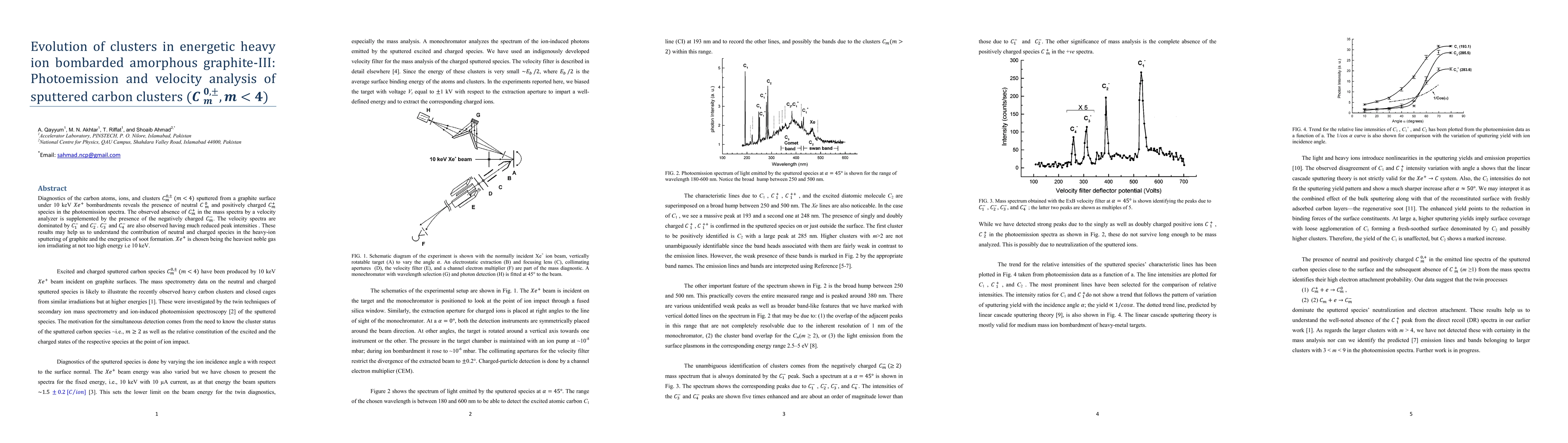 Diagnostics of the carbon atoms, ions, and clusters sputtered from a graphite surface under 10 keV Xe ion bombardments reveals the presence of neutral carbon clusters and positively charged species in the photo-emission spectra. The observed absence of the positively charged clusters in the mass spectra by a velocity analyzer is supplemented by the presence of the negatively charged monatomic, diatomic, triatomic and quatratomic clusters.. The velocity spectra are dominated by the negative C1, C2, C3 and C4. The latter two are observed having much reduced peak intensities . These results may help us to understand the contribution of neutral and charged species in the heavy-ion sputtering of graphite and the energetics of soot formation. Xe is chosen being the heaviest noble gas ion irradiating at not too high energy i.e 10 keV.