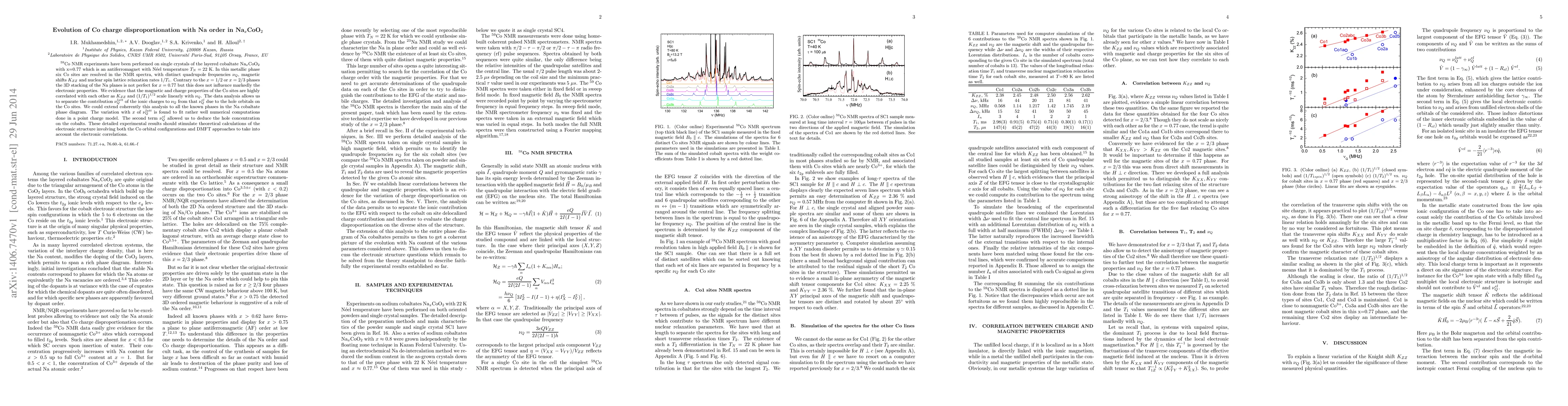 $^{59}$Co NMR experiments have been performed on single crystals of the layered cobaltate Na$_{x}$CoO$_{2}$ with x=0.77 which is an antiferromagnet with N\'eel temperature $T_{N}=22$~K. In this metallic phase six Co sites are resolved in the NMR spectra, with distinct quadrupole frequencies $\nu _{Q}$, magnetic shifts $K_{ZZ}$ and nuclear spin lattice relaxation rates $% 1/T_{1}$. Contrary to the $x=1/2$ or $x=2/3$ phases the 3D stacking of the Na planes is not perfect for $x=0.77$ but this does not influence markedly the electronic properties. We evidence that the magnetic and charge properties of the Co sites are highly correlated with each other as $K_{ZZ}$ and $(1/T_{1})^{1/2}$ scale linearly with $\nu _{Q}$. The data analysis allows us to separate the contribution $\nu_{Q}^{latt}$ of the ionic charges to $\nu _{Q}$ from that $\nu _{Q}^{el}$ due to the hole orbitals on the Co sites. We could extend coherently this analysis to all the known phases in the Na cobaltate phase diagram. The variation with $x$ of $\nu _{Q}^{latt}$ is found to fit rather well numerical computations done in a point charge model. The second term $\nu _{Q}^{el}$ allowed us to deduce the hole concentration on the cobalts. These detailed experimental results should stimulate theoretical calculations of the electronic structure involving both the Co orbital configurations and DMFT approaches to take into account the electronic correlations.