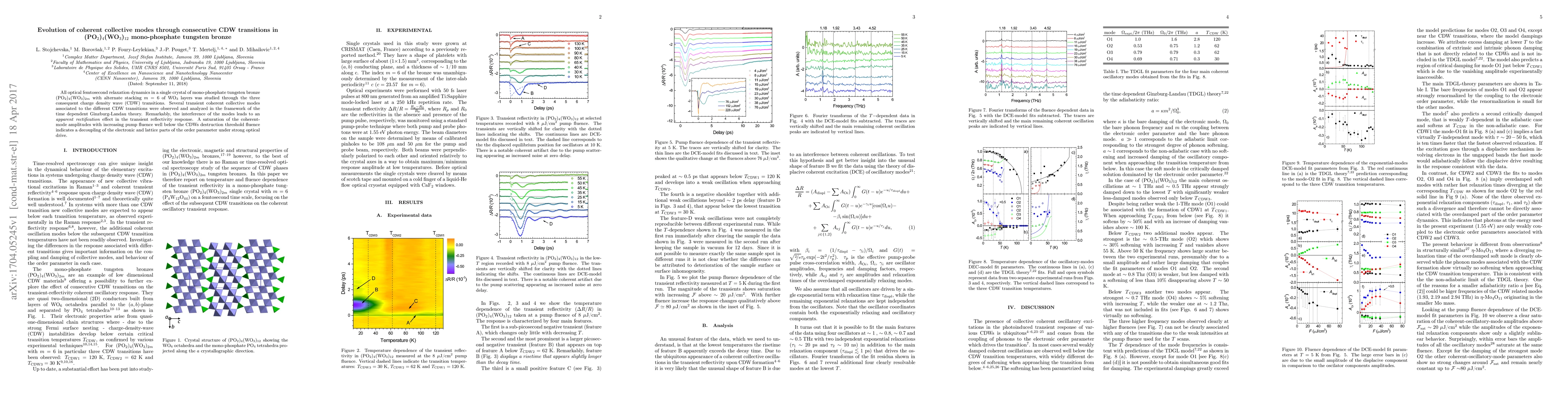 All optical femtosecond relaxation dynamics in a single crystal of mono-phosphate tungsten bronze (PO$_{2}$)$_{4}$(WO$_{3}$)$_{2m}$ with alternate stacking m=6 of WO$_{3}$ layers was studied through the three consequent charge density wave (CDW) transitions. Several transient coherent collective modes associated to the different CDW transitions were observed and analyzed in the framework of the time dependent Ginzburg-Landau theory. Remarkably, the interference of the modes leads to an apparent rectification effect in the transient reflectivity response. A saturation of the coherent-mode amplitudes with increasing pump fluence well below the CDWs destruction threshold fluence indicates a decoupling of the electronic and lattice parts of the order parameter under strong optical drive.