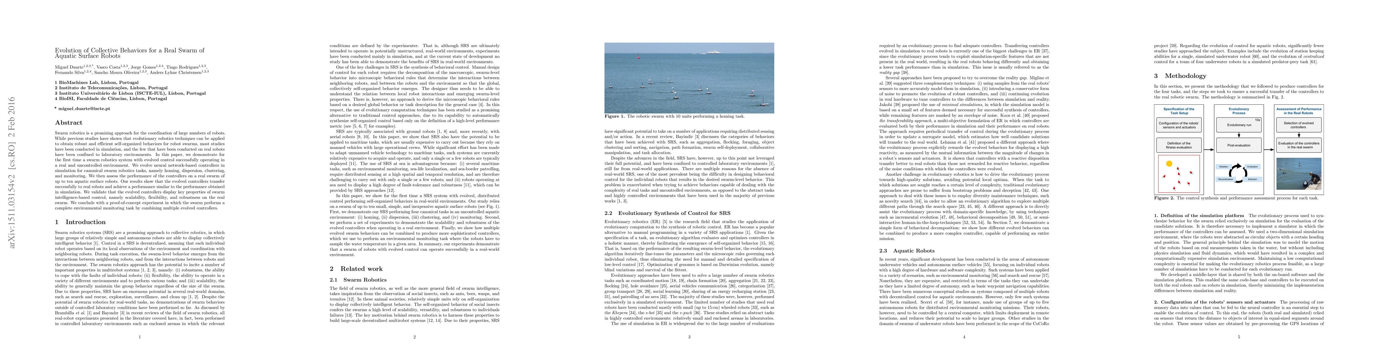 This paper demonstrates the evolution of neural network-based controllers for a real swarm of aquatic surface robots, showing successful transfer from simulation to real-world performance. The evolved controllers exhibit scalability, flexibility, and robustness in an uncontrolled environment.