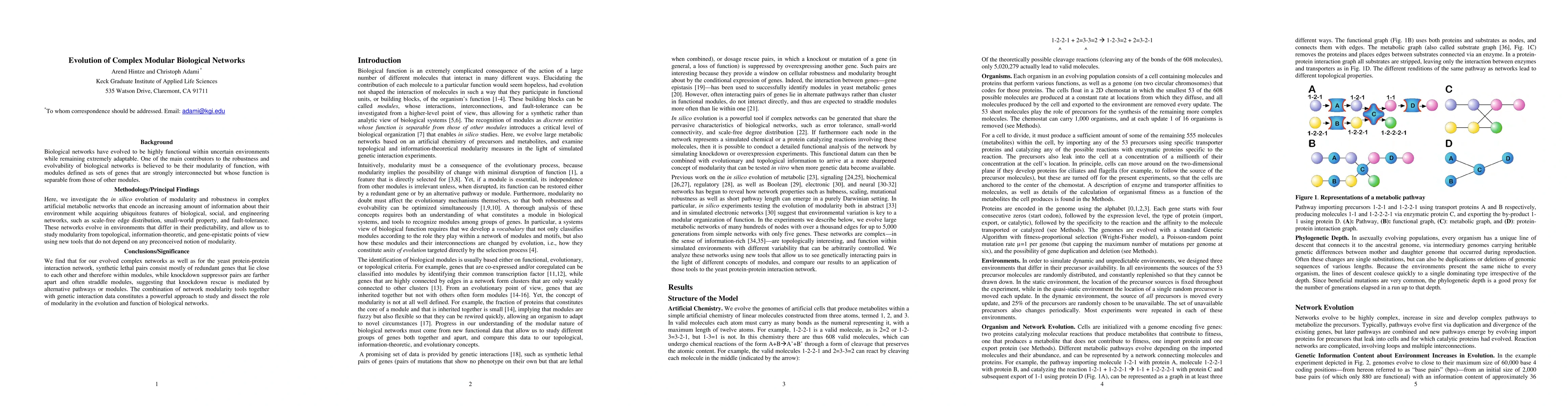 Biological networks have evolved to be highly functional within uncertain environments while remaining extremely adaptable. One of the main contributors to the robustness and evolvability of biological networks is believed to be their modularity of function, with modules defined as sets of genes that are strongly interconnected but whose function is separable from those of other modules. Here, we investigate the in silico evolution of modularity and robustness in complex artificial metabolic networks that encode an increasing amount of information about their environment while acquiring ubiquitous features of biological, social, and engineering networks, such as scale-free edge distribution, small-world property, and fault-tolerance. These networks evolve in environments that differ in their predictability, and allow us to study modularity from topological, information-theoretic, and gene-epistatic points of view using new tools that do not depend on any preconceived notion of modularity. We find that for our evolved complex networks as well as for the yeast protein-protein interaction network, synthetic lethal pairs consist mostly of redundant genes that lie close to each other and therefore within modules, while knockdown suppressor pairs are farther apart and often straddle modules, suggesting that knockdown rescue is mediated by alternative pathways or modules. The combination of network modularity tools together with genetic interaction data constitutes a powerful approach to study and dissect the role of modularity in the evolution and function of biological networks.
