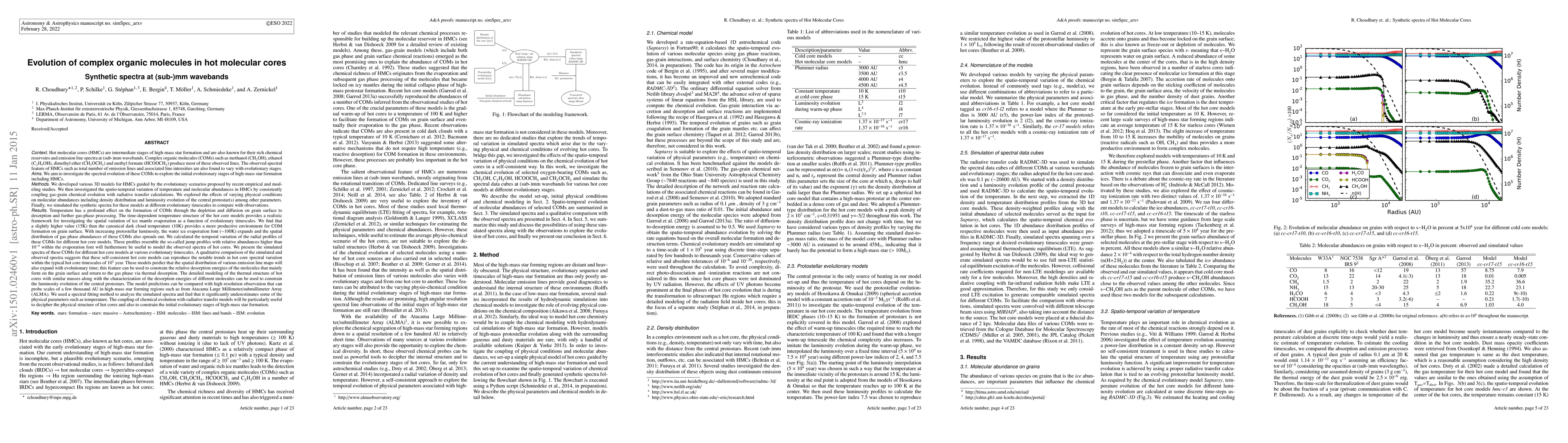 Hot molecular cores (HMCs) are intermediate stages of high-mass star formation and are also known for their rich emission line spectra at (sub-)mm wavebands. The observed spectral feature of HMCs such as total number of emission lines and associated line intensities are also found to vary with evolutionary stages. We developed various 3D models for HMCs guided by the evolutionary scenarios proposed by recent empirical and modeling studies. We then investigated the spatio-temporal variation of temperature and molecular abundances in HMCs by consistently coupling gas-grain chemical evolution with radiative transfer calculations. We explored the effects of varying physical conditions on molecular abundances including density distribution and luminosity evolution of the central protostar(s). The time-dependent temperature structure of the hot core models provides a realistic framework for investigating the spatial variation of ice mantle evaporation as a function of evolutionary timescales. With increasing protostellar luminosity, the water ice evaporation font ($\sim$100K) expands and the spatial distribution of gas phase abundances of these COMs also spreads out. We simulated the synthetic spectra for these models at different evolutionary timescales to compare with observations. A qualitative comparison of the simulated and observed spectra suggests that these self-consistent hot core models can reproduce the notable trends in hot core spectral variation within the typical hot core timescales of 10$^{5}$ year. These models predict that the spatial distribution of various emission line maps will also expand with evolutionary time. The model predictions can be compared with high resolution observation that can probe scales of a few thousand AU in high-mass star forming regions such as from ALMA.[Abridged]