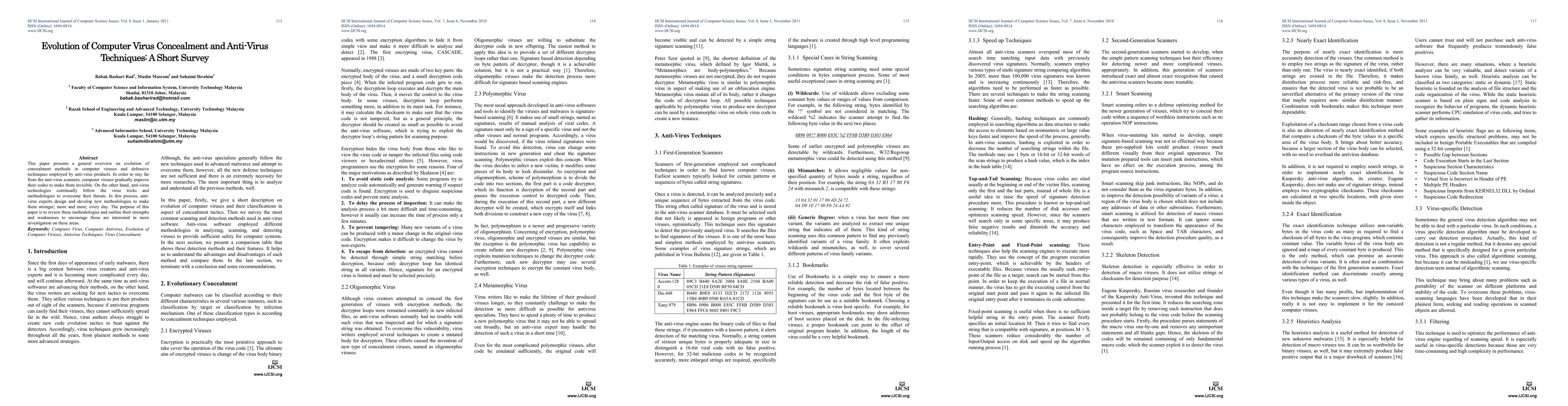 This paper surveys the evolving strategies of computer viruses to evade detection and the corresponding advancements in anti-virus techniques. It highlights the cat-and-mouse dynamic between virus concealment methods and anti-virus defenses, emphasizing the strengths and weaknesses of each approach.