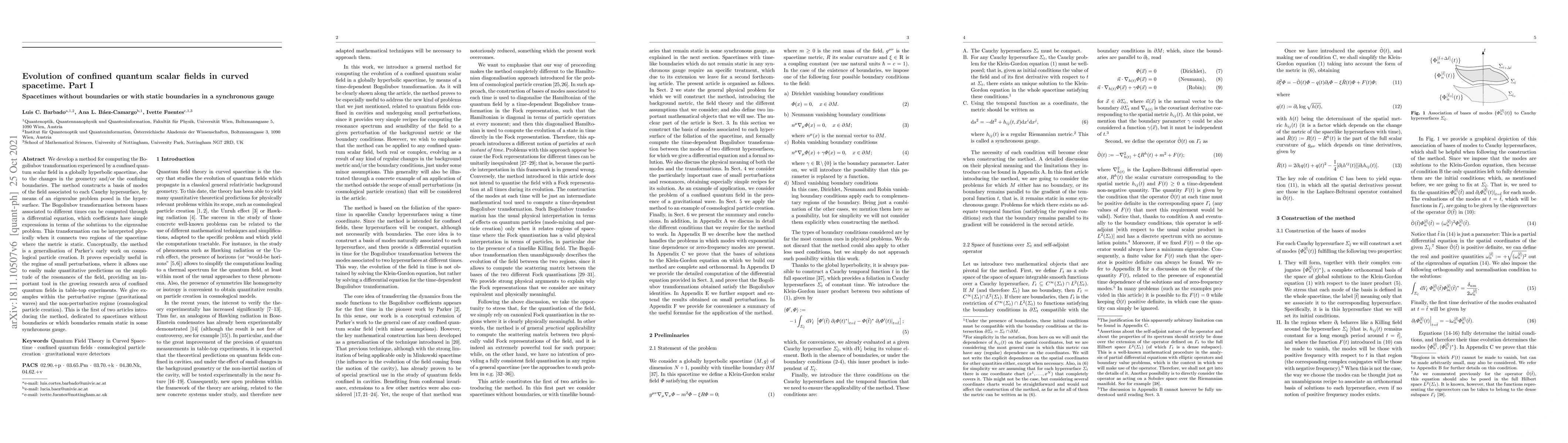We develop a method for computing the Bogoliubov transformation experienced by a confined quantum scalar field in a globally hyperbolic spacetime, due to the changes in the geometry and/or the confining boundaries. The method constructs a basis of modes of the field associated to each Cauchy hypersurface, by means of an eigenvalue problem posed in the hypersurface. The Bogoliubov transformation between bases associated to different times can be computed through a differential equation, which coefficients have simple expressions in terms of the solutions to the eigenvalue problem. This transformation can be interpreted physically when it connects two regions of the spacetime where the metric is static. Conceptually, the method is a generalisation of Parker's early work on cosmological particle creation. It proves especially useful in the regime of small perturbations, where it allows one to easily make quantitative predictions on the amplitude of the resonances of the field, providing an important tool in the growing research area of confined quantum fields in table-top experiments. We give examples within the perturbative regime (gravitational waves) and the non-perturbative regime (cosmological particle creation). This is the first of two articles introducing the method, dedicated to spacetimes without boundaries or which boundaries remain static in some synchronous gauge.