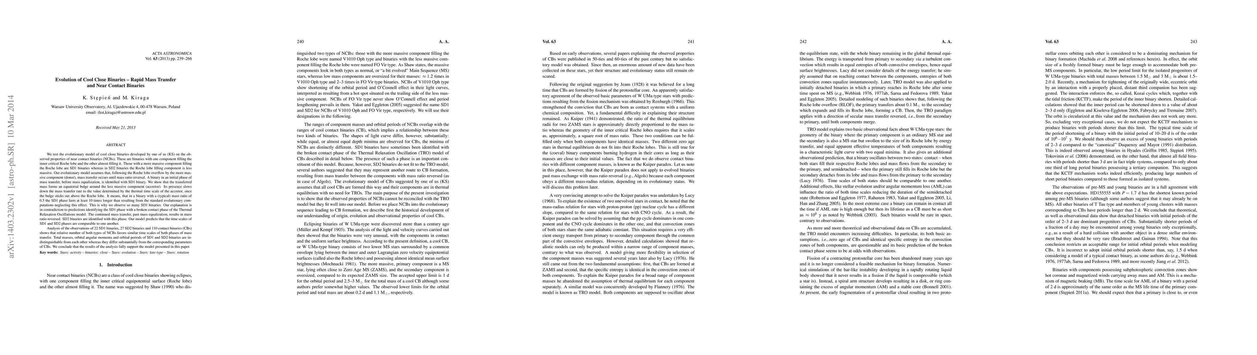 [Abridged] We test the evolutionary model of cool close binaries on the observed properties of near contact binaries (NCBs). Those with a more massive component filling the Roche lobe are SD1 binaries whereas in SD2 binaries the Roche lobe filling component is less massive. Our evolutionary model assumes that, following the Roche lobe overflow by the more massive component (donor), mass transfer occurs until mass ratio reversal. A binary in an initial phase of mass transfer, before mass equalization, is identified with SD1 binary. We show that the transferred mass forms an equatorial bulge around the less massive component (accretor). Its presence slows down the mass transfer rate to the value determined by the thermal time scale of the accretor, once the bulge sticks out above the Roche lobe. It means, that in a binary with a (typical) mass ratio of 0.5 the SD1 phase lasts at least 10 times longer than resulting from the standard evolutionary computations neglecting this effect. This is why we observe so many SD1 binaries. Our explanation is in contradiction to predictions identifying the SD1 phase with a broken contact phase of the Thermal Relaxation Oscillations model. The continued mass transfer, past mass equalization, results in mass ratio reversed. SD2 binaries are identified with this phase. Our model predicts that the time scales of SD1 and SD2 phases are comparable to one another. Analysis of the observations of 22 SD1 binaries, 27 SD2 binaries and 110 contact binaries (CBs) shows that relative number of both types of NCBs favors similar time scales of both phases of mass transfer. Total masses, orbital angular momenta and orbital periods of SD1 and SD2 binaries are indistinguishable from each other whereas they differ substantially from the corresponding parameters of CBs. We conclude that the results of the analysis fully support the model presented in this paper.