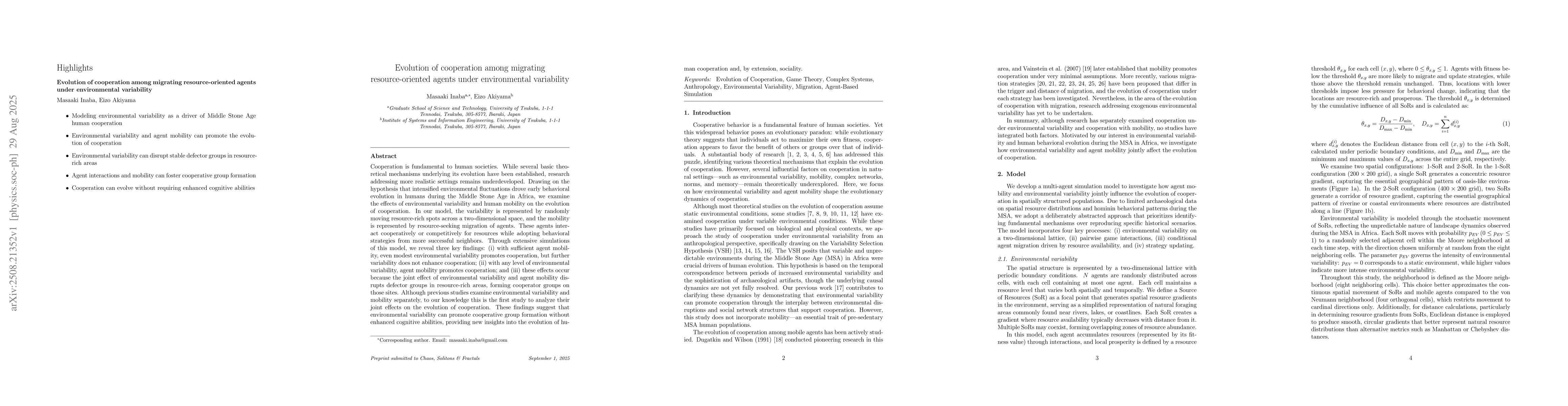 Cooperation is fundamental to human societies. While several basic theoretical mechanisms underlying its evolution have been established, research addressing more realistic settings remains underdeveloped. Drawing on the hypothesis that intensified environmental fluctuations drove early behavioral evolution in humans during the Middle Stone Age in Africa, we examine the effects of environmental variability and human mobility on the evolution of cooperation. In our model, the variability is represented by randomly moving resource-rich spots across a two-dimensional space, and the mobility is represented by resource-seeking migration of agents. These agents interact cooperatively or competitively for resources while adopting behavioral strategies from more successful neighbors. Through extensive simulations of this model, we reveal three key findings: (i) with sufficient agent mobility, even modest environmental variability promotes cooperation, but further variability does not enhance cooperation; (ii) with any level of environmental variability, agent mobility promotes cooperation; and (iii) these effects occur because the joint effect of environmental variability and agent mobility disrupts defector groups in resource-rich areas, forming cooperator groups on those sites. Although previous studies examine environmental variability and mobility separately, to our knowledge this is the first study to analyze their joint effects on the evolution of cooperation. These findings suggest that environmental variability can promote cooperative group formation without enhanced cognitive abilities, providing new insights into the evolution of human cooperation and, by extension, sociality.